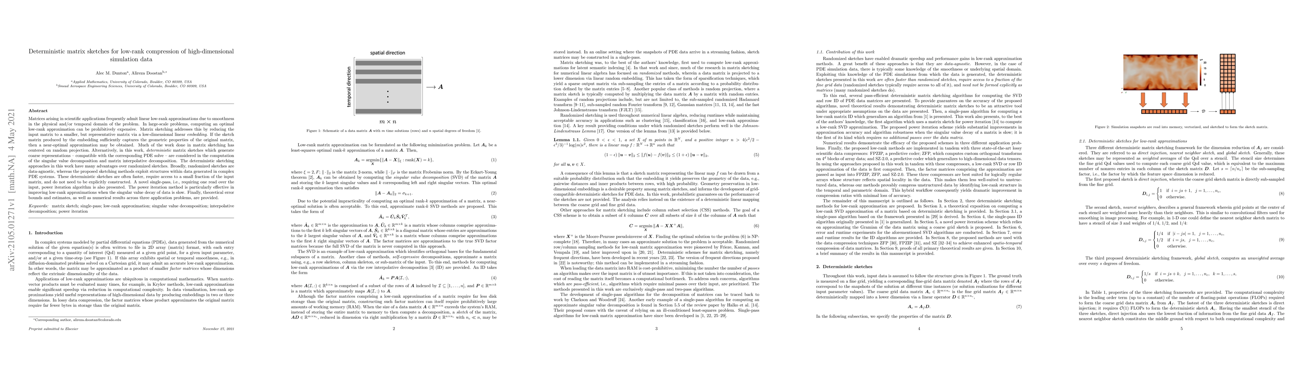 This paper proposes deterministic matrix sketching techniques for efficiently computing low-rank approximations of high-dimensional simulation data, particularly in PDE systems. These methods outperform randomized sketches by leveraging data structures, requiring fewer computations and less data access, and are complemented by a novel single-pass power iteration algorithm.