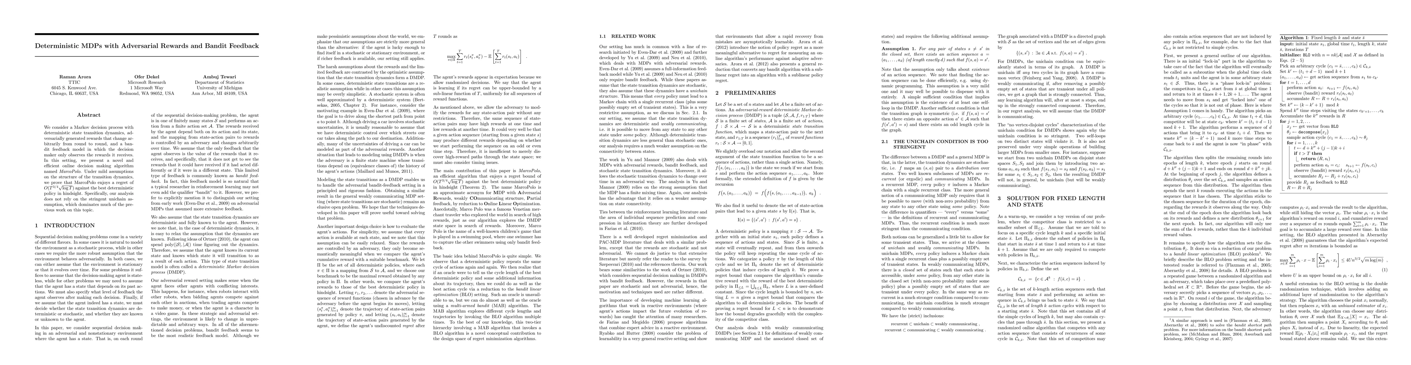 We consider a Markov decision process with deterministic state transition dynamics, adversarially generated rewards that change arbitrarily from round to round, and a bandit feedback model in which the decision maker only observes the rewards it receives. In this setting, we present a novel and efficient online decision making algorithm named MarcoPolo. Under mild assumptions on the structure of the transition dynamics, we prove that MarcoPolo enjoys a regret of O(T^(3/4)sqrt(log(T))) against the best deterministic policy in hindsight. Specifically, our analysis does not rely on the stringent unichain assumption, which dominates much of the previous work on this topic.