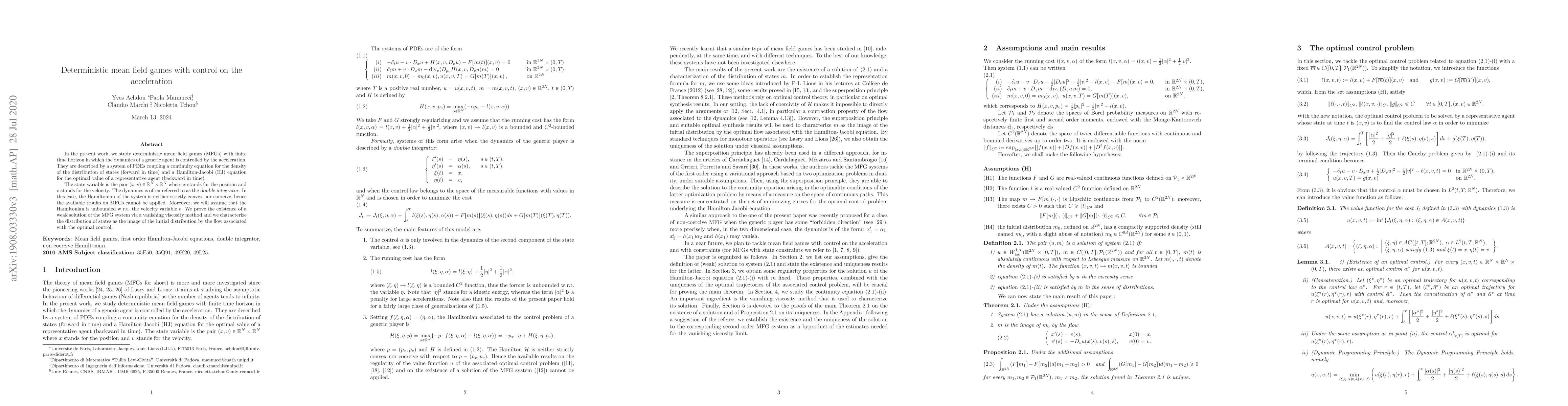 This paper explores deterministic mean field games with finite time horizon where agents' dynamics are controlled by acceleration, modeled by a double integrator system. It proves the existence of a weak solution using a vanishing viscosity method and characterizes the state distribution evolution.