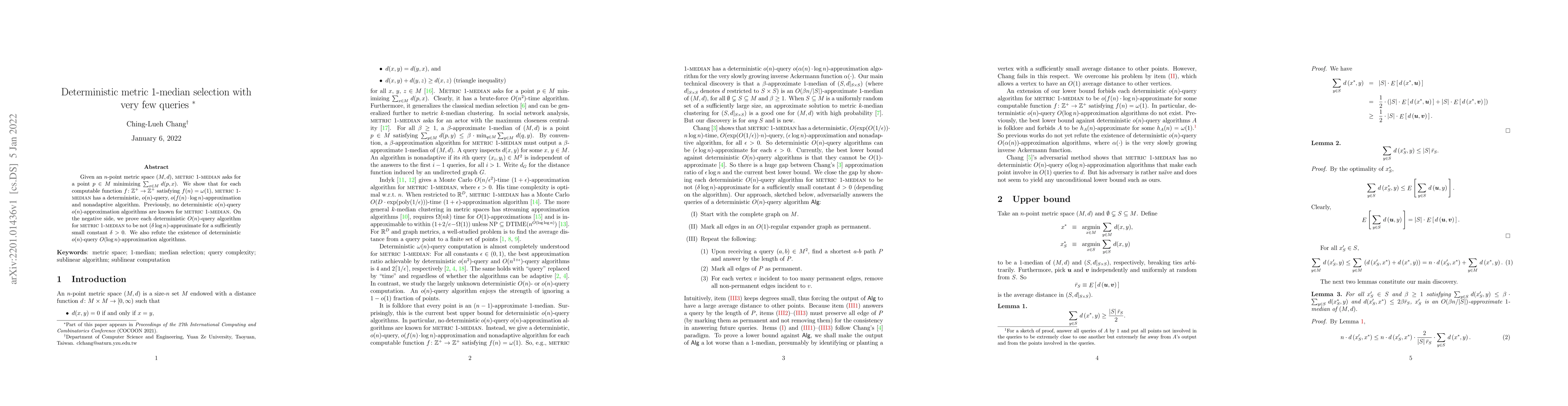 Given an $n$-point metric space $(M,d)$, {\sc metric $1$-median} asks for a point $p\in M$ minimizing $\sum_{x\in M}\,d(p,x)$. We show that for each computable function $f\colon \mathbb{Z}^+\to\mathbb{Z}^+$ satisfying $f(n)=\omega(1)$, {\sc metric $1$-median} has a deterministic, $o(n)$-query, $o(f(n)\cdot\log n)$-approximation and nonadaptive algorithm. Previously, no deterministic $o(n)$-query $o(n)$-approximation algorithms are known for {\sc metric $1$-median}. On the negative side, we prove each deterministic $O(n)$-query algorithm for {\sc metric $1$-median} to be not $(\delta\log n)$-approximate for a sufficiently small constant $\delta>0$. We also refute the existence of deterministic $o(n)$-query $O(\log n)$-approximation algorithms.