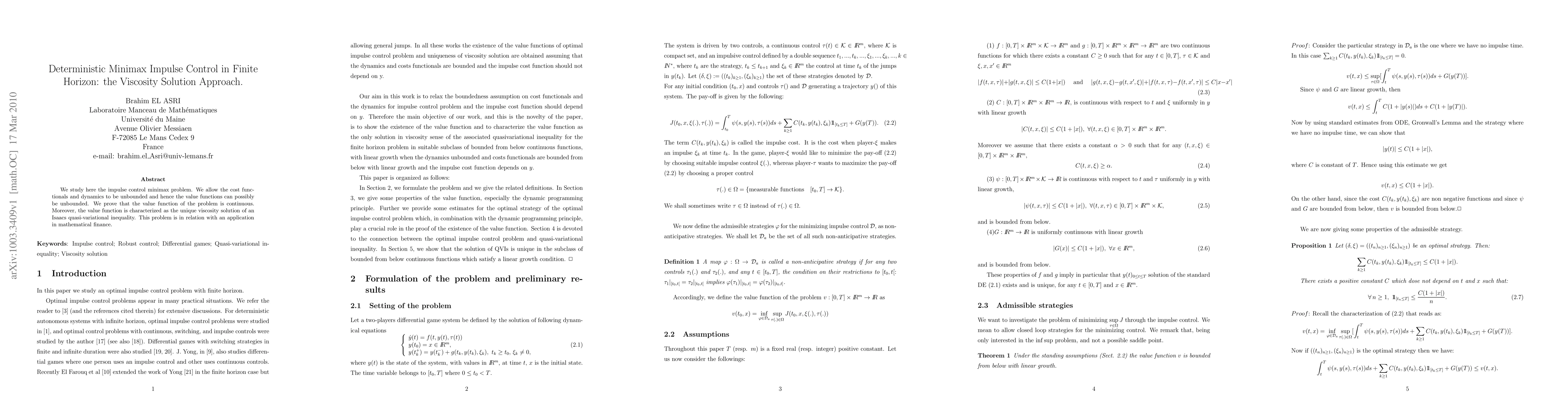 This paper investigates the minimax impulse control problem with potentially unbounded cost functionals and dynamics, proving the continuity of the value function. It characterizes the value function as the unique viscosity solution to an Isaacs quasi-variational inequality, relevant to applications in mathematical finance.