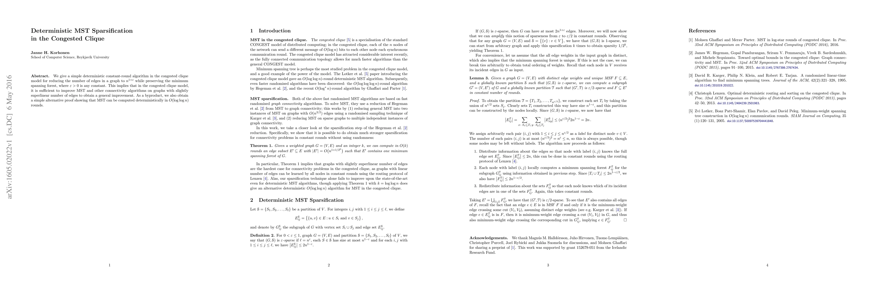 The authors propose a deterministic constant-round algorithm for reducing the number of edges in a graph to $n^{1+rac{eta}{2}}$ while preserving the minimum spanning forest.