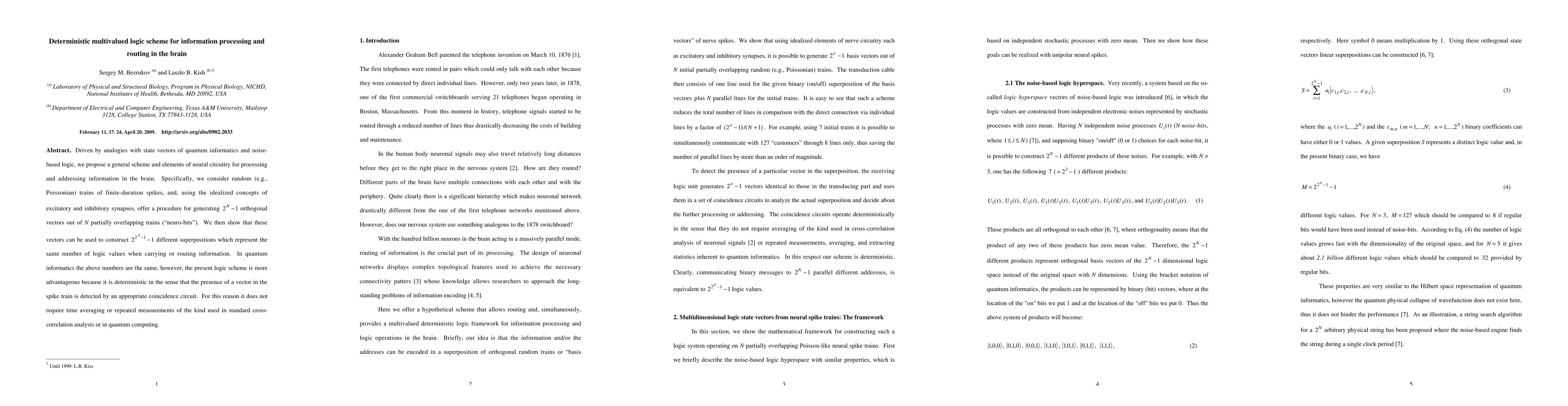Driven by analogies with state vectors of quantum informatics and noise-based logic, we propose a general scheme and elements of neural circuitry for processing and addressing information in the brain. Specifically, we consider random (e.g., Poissonian) trains of finite-duration spikes, and, using the idealized concepts of excitatory and inhibitory synapses, offer a procedure for generating 2^N-1 orthogonal vectors out of N partially overlapping trains ("neuro-bits"). We then show that these vectors can be used to construct 2^(2^N-1)-1 different superpositions which represent the same number of logic values when carrying or routing information. In quantum informatics the above numbers are the same, however, the present logic scheme is more advantageous because it is deterministic in the sense that the presence of a vector in the spike train is detected by an appropriate coincidence circuit. For this reason it does not require time averaging or repeated measurements of the kind used in standard cross-correlation analysis or in quantum computing.