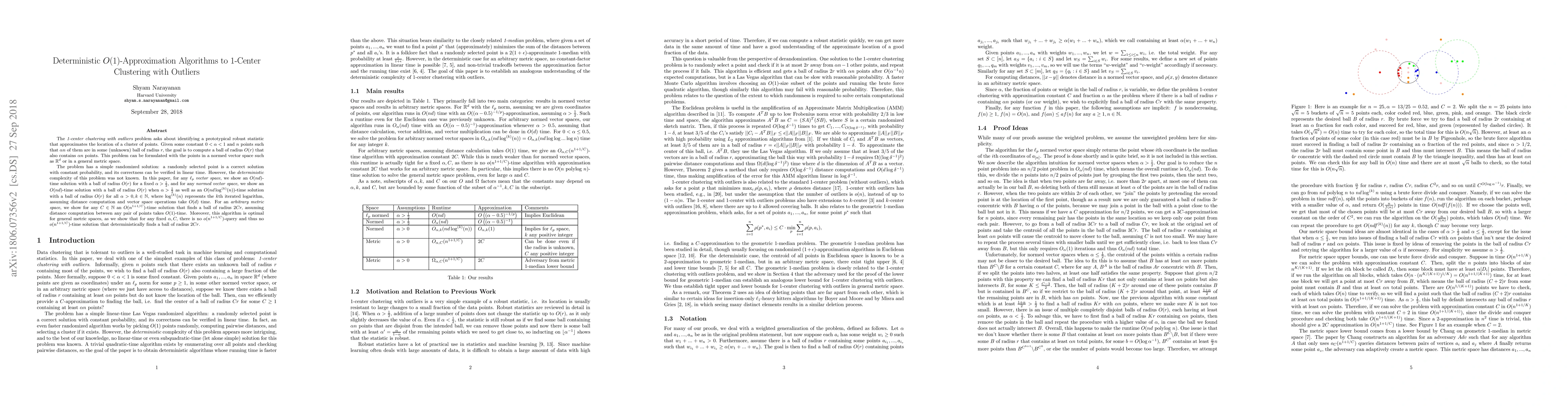 The 1-center clustering with outliers problem asks about identifying a prototypical robust statistic that approximates the location of a cluster of points. Given some constant $0 < \alpha < 1$ and $n$ points such that $\alpha n$ of them are in some (unknown) ball of radius $r,$ the goal is to compute a ball of radius $O(r)$ that also contains $\alpha n$ points. This problem can be formulated with the points in a normed vector space such as $\mathbb{R}^d$ or in a general metric space. The problem has a simple randomized solution: a randomly selected point is a correct solution with constant probability, and its correctness can be verified in linear time. However, the deterministic complexity of this problem was not known. In this paper, for any $\ell_p$ vector space, we show an $O(nd)$-time solution with a ball of radius $O(r)$ for a fixed $\alpha > \frac{1}{2},$ and for any normed vector space, we show an $O(nd)$-time solution with a ball of radius $O(r)$ when $\alpha > \frac{1}{2}$ as well as an $O (nd \log^{(k)}(n))$-time solution with a ball of radius $O(r)$ for all $\alpha > 0, k \in \mathbb{N},$ where $\log^{(k)}(n)$ represents the $k$th iterated logarithm, assuming distance computation and vector space operations take $O(d)$ time. For an arbitrary metric space, we show for any $C \in \mathbb{N}$ an $O(n^{1+1/C})$-time solution that finds a ball of radius $2Cr,$ assuming distance computation between any pair of points takes $O(1)$-time. Moreover, this algorithm is optimal for general metric spaces, as we show that for any fixed $\alpha, C,$ there is no $o(n^{1+1/C})$-query and thus no $o(n^{1+1/C})$-time solution that deterministically finds a ball of radius $2Cr$.