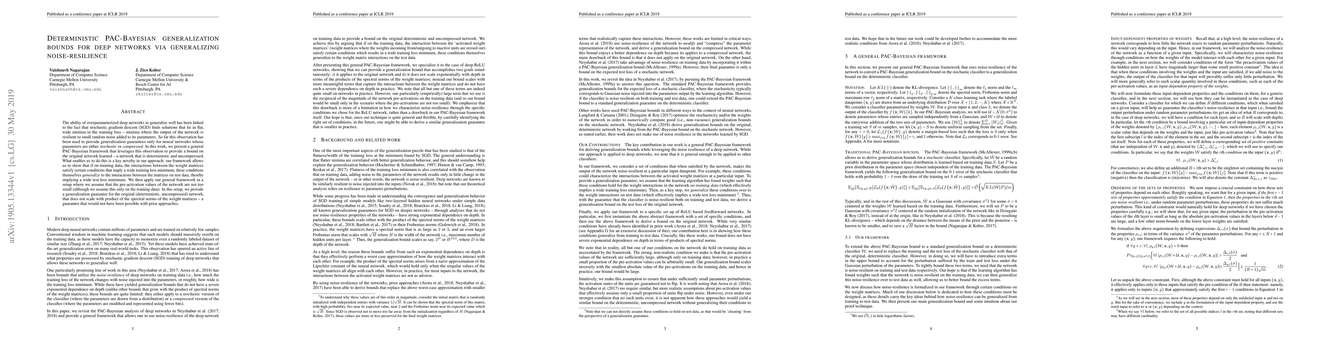 The ability of overparameterized deep networks to generalize well has been linked to the fact that stochastic gradient descent (SGD) finds solutions that lie in flat, wide minima in the training loss -- minima where the output of the network is resilient to small random noise added to its parameters. So far this observation has been used to provide generalization guarantees only for neural networks whose parameters are either \textit{stochastic} or \textit{compressed}. In this work, we present a general PAC-Bayesian framework that leverages this observation to provide a bound on the original network learned -- a network that is deterministic and uncompressed. What enables us to do this is a key novelty in our approach: our framework allows us to show that if on training data, the interactions between the weight matrices satisfy certain conditions that imply a wide training loss minimum, these conditions themselves {\em generalize} to the interactions between the matrices on test data, thereby implying a wide test loss minimum. We then apply our general framework in a setup where we assume that the pre-activation values of the network are not too small (although we assume this only on the training data). In this setup, we provide a generalization guarantee for the original (deterministic, uncompressed) network, that does not scale with product of the spectral norms of the weight matrices -- a guarantee that would not have been possible with prior approaches.