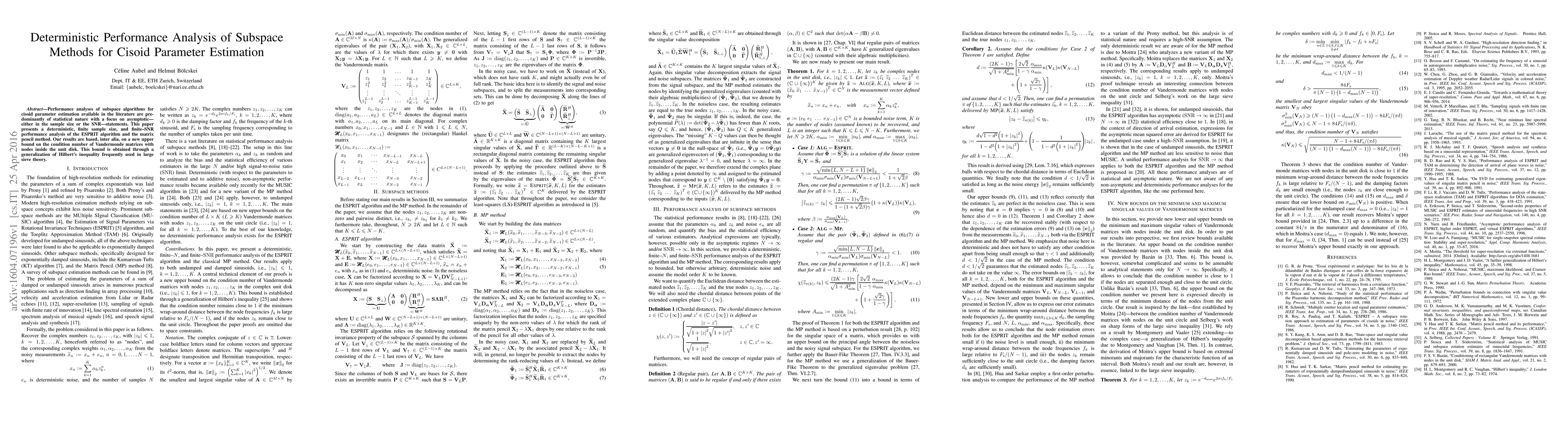 This paper provides a deterministic, finite-sample size and finite-SNR performance analysis of subspace methods (ESPRIT and matrix pencil) for cisoid parameter estimation, introducing a new upper bound on the condition number of Vandermonde matrices via a generalized Hilbert's inequality.