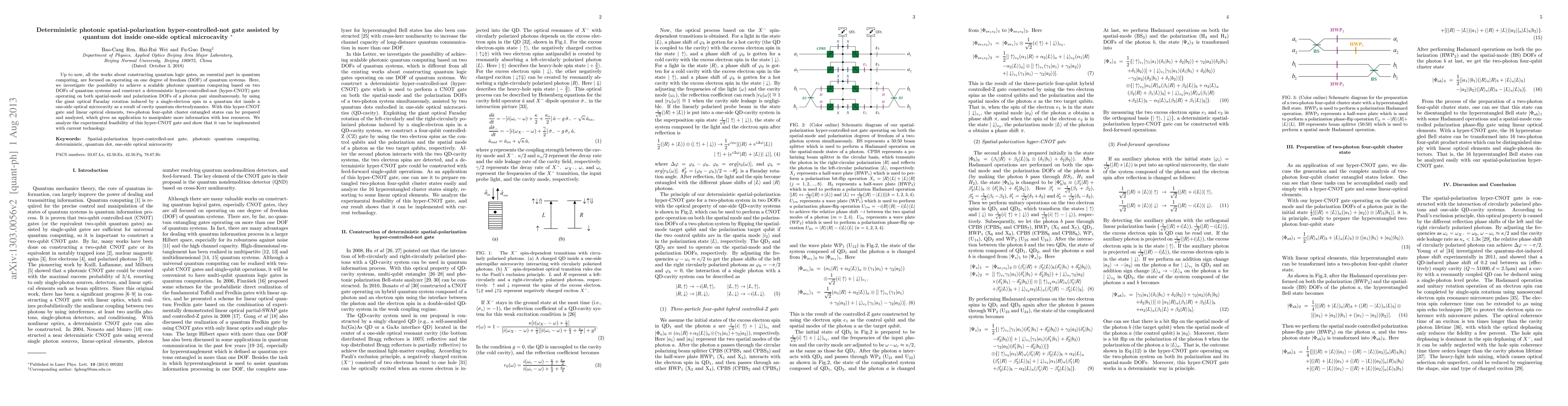 Up to now, all the works about constructing quantum logic gates, an essential part in quantum computing, are focused on operating on one degree of freedom (DOF) of quantum systems. Here, we investigate the possibility to achieve a scalable photonic quantum computing based on two DOFs of quantum systems and construct a deterministic hyper-controlled-not (hyper-CNOT) gate operating on both spatial-mode and polarization DOFs of a photon pair simultaneously, by using the giant optical Faraday rotation induced by a single-electron spin in a quantum dot inside a one-side optical microcavity as a result of cavity quantum electrodynamics. With this hyper-CNOT gate and linear optical elements, two-photon four-qubit cluster entangled states can be prepared and analyzed, which gives an application to manipulate more information with less resources. We analyze the experimental feasibility of this hyper-CNOT gate and show that it can be implemented with current technology.