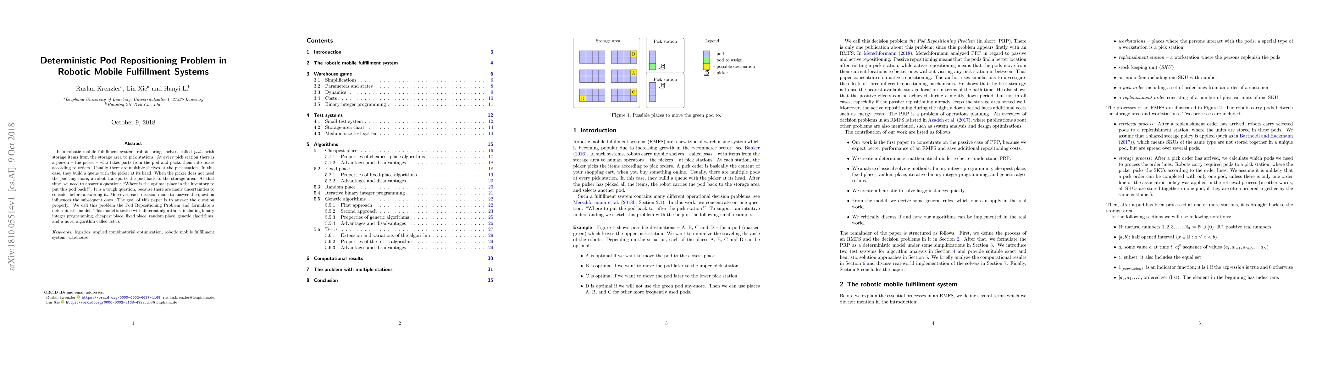 This paper addresses the deterministic Pod Repositioning Problem in robotic mobile fulfillment systems, where robots return shelves to optimal storage locations after use. The authors propose a deterministic model and test it using various algorithms, including binary integer programming, genetic algorithms, and a novel Tetris-inspired method.