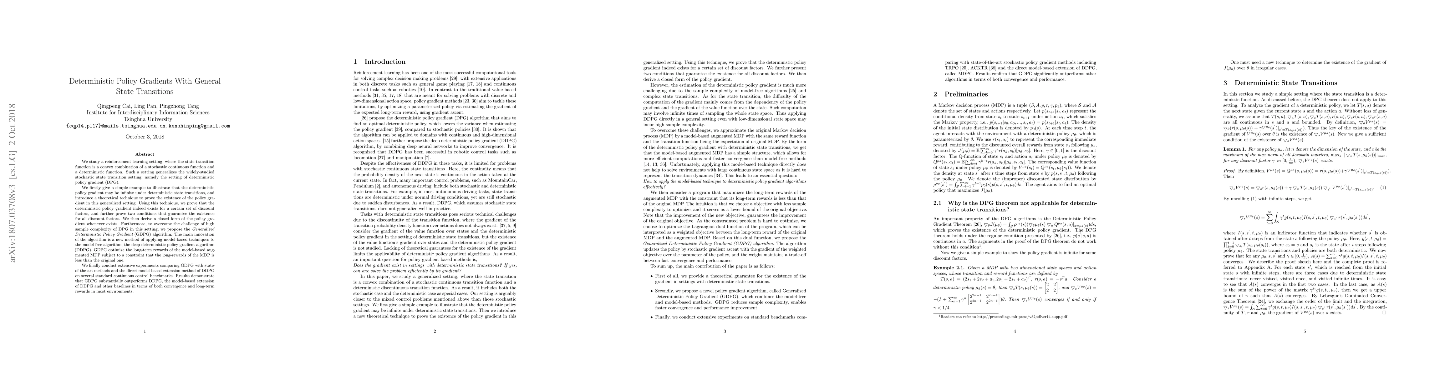 The paper studies reinforcement learning with general state transitions, combining stochastic and deterministic components, and proves the existence of deterministic policy gradients for certain discount factors. It introduces the Generalized Deterministic Policy Gradient (GDPG) algorithm, which optimizes a model-based augmented MDP with a constraint on the original MDP's long-term rewards.
