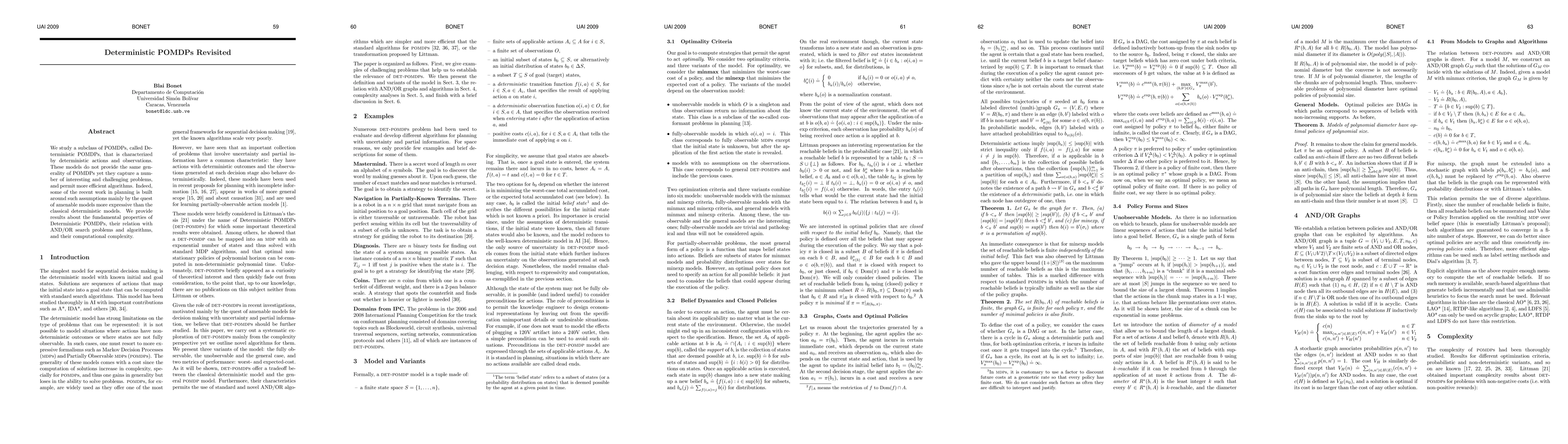 This paper explores Deterministic POMDPs, a specialized subclass with deterministic actions and observations, which allows for more efficient algorithms compared to general POMDPs. It investigates their properties, connections to AND/OR search problems, and computational complexity.