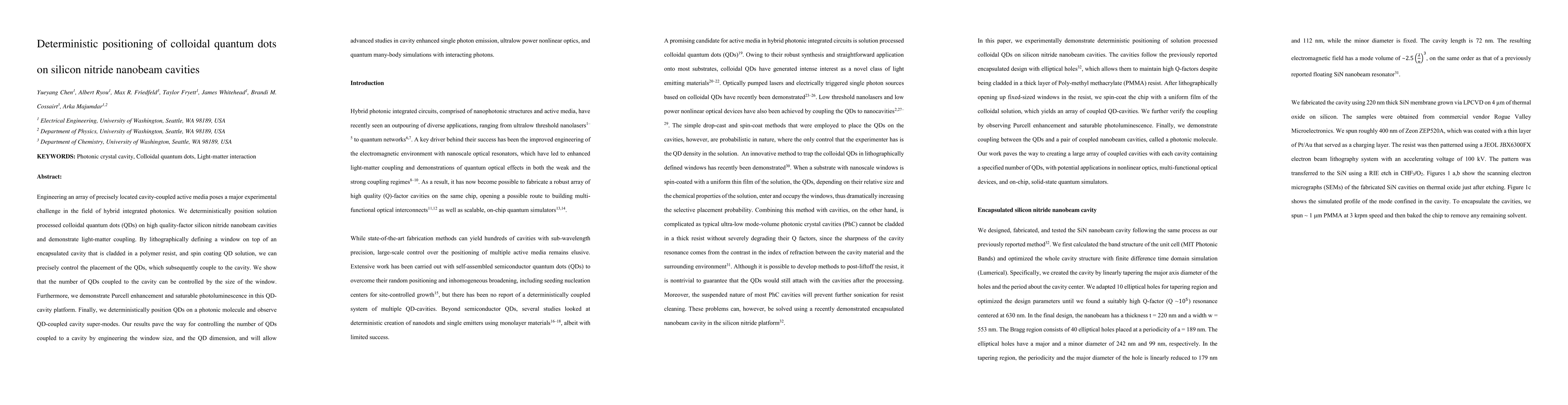 This paper details a method for deterministically positioning colloidal quantum dots on silicon nitride nanobeam cavities, achieving precise light-matter coupling and demonstrating control over the number of coupled dots via window size engineering. The study also shows Purcell enhancement and paves the way for advanced photonic applications.