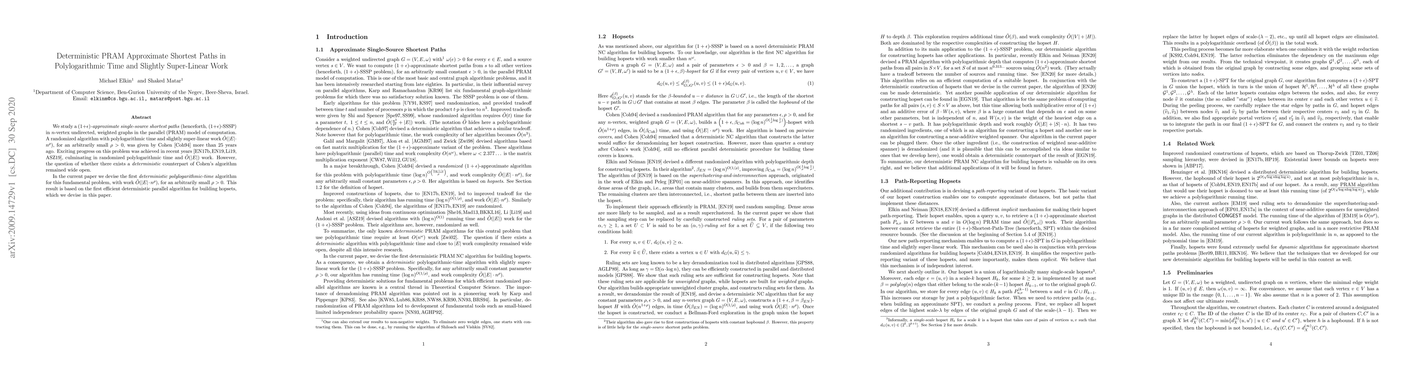 We study a $(1+\epsilon)$-approximate single-source shortest paths (henceforth, $(1+\epsilon)$-SSSP) in $n$-vertex undirected, weighted graphs in the parallel (PRAM) model of computation. A randomized algorithm with polylogarithmic time and slightly super-linear work $\tilde{O}(|E|\cdot n^\rho)$, for an arbitrarily small $\rho>0$, was given by Cohen [Coh94] more than $25$ years ago. Exciting progress on this problem was achieved in recent years [ElkinN17,ElkinN19,Li19,AndoniSZ19], culminating in randomized polylogarithmic time and $\tilde{O}(|E|)$ work. However, the question of whether there exists a deterministic counterpart of Cohen's algorithm remained wide open. In the current paper we devise the first deterministic polylogarithmic-time algorithm for this fundamental problem, with work $\tilde{O}(|E|\cdot n^\rho)$, for an arbitrarily small $\rho>0$. This result is based on the first efficient deterministic parallel algorithm for building hopsets, which we devise in this paper.