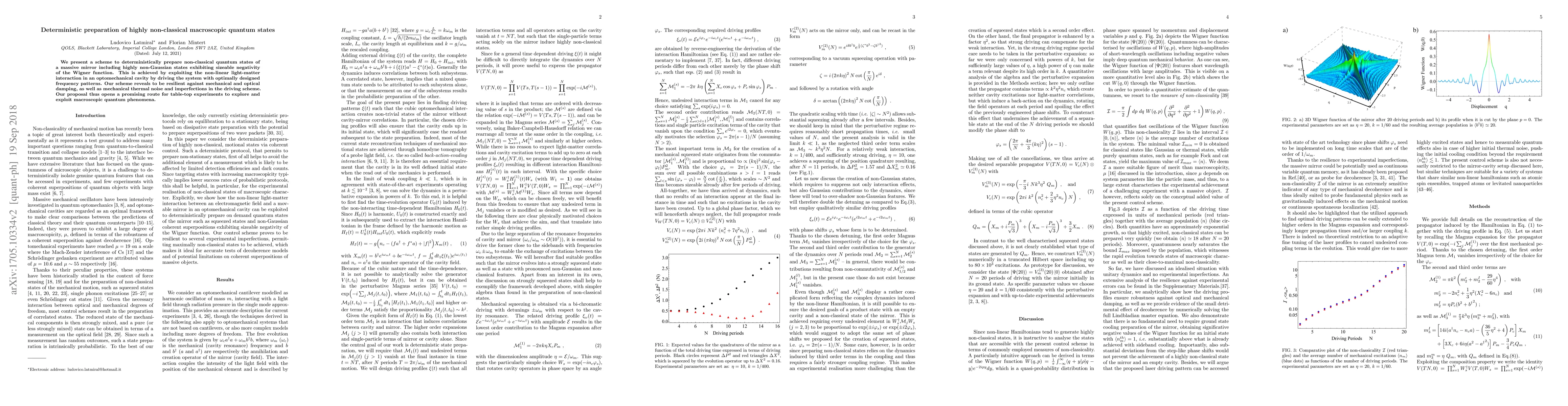 We present a scheme to deterministically prepare non-classical quantum states of a massive mirror including highly non-Gaussian states exhibiting sizeable negativity of the Wigner function. This is achieved by exploiting the non-linear light-matter interaction in an optomechanical cavity by driving the system with optimally designed frequency patterns. Our scheme reveals to be resilient against mechanical and optical damping, as well as mechanical thermal noise and imperfections in the driving scheme. Our proposal thus opens a promising route for table-top experiments to explore and exploit macroscopic quantum phenomena.