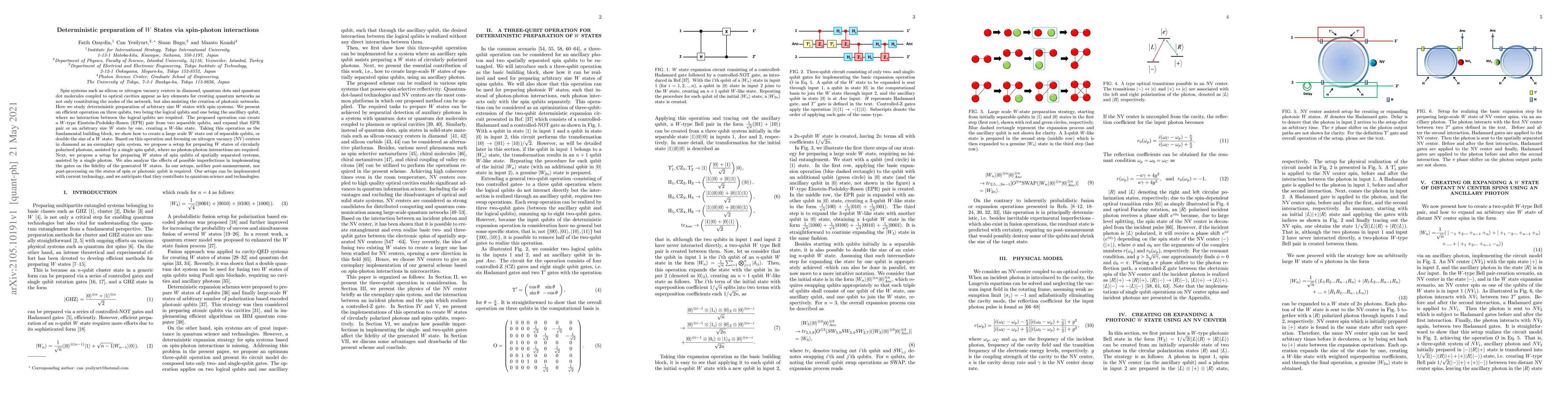 This paper proposes a method for deterministically preparing $W$ states using spin-photon interactions, focusing on systems like nitrogen vacancy centers in diamond. It details an efficient operation on three qubits to create $W$-type Einstein-Podolsky-Rosen pairs and expand them, requiring no photon-photon interactions and no post-measurement or post-processing.