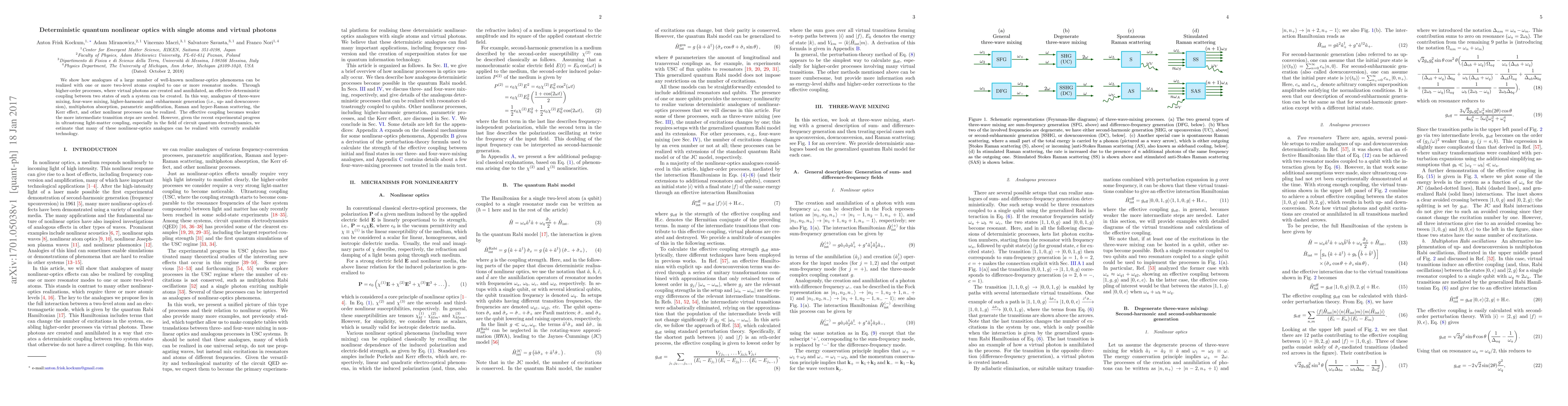 We show how analogues of a large number of well-known nonlinear-optics phenomena can be realized with one or more two-level atoms coupled to one or more resonator modes. Through higher-order processes, where virtual photons are created and annihilated, an effective deterministic coupling between two states of such a system can be created. In this way, analogues of three-wave mixing, four-wave mixing, higher-harmonic and -subharmonic generation (i.e., up- and downconversion), multiphoton absorption, parametric amplification, Raman and hyper-Raman scattering, the Kerr effect, and other nonlinear processes can be realized. The effective coupling becomes weaker the more intermediate transition steps are needed. However, given the recent experimental progress in ultrastrong light-matter coupling, especially in the field of circuit quantum electrodynamics, we estimate that many of these nonlinear-optics analogues can be realized with currently available technology.