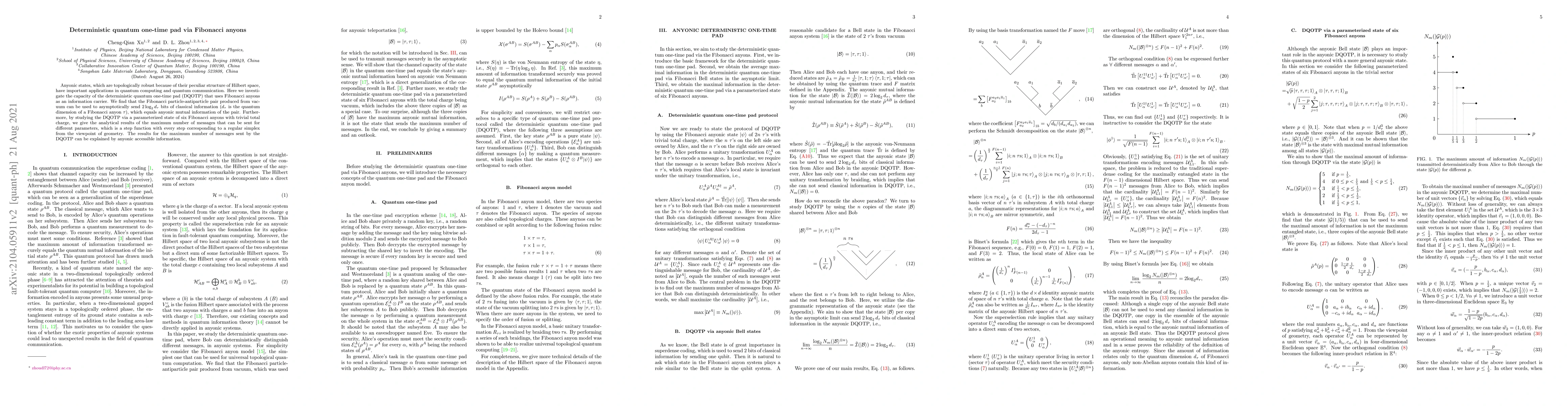 Anyonic states, which are topologically robust originated from their peculiar structure of Hilbert space, have important applications in quantum computing and quantum communication. When an anyonic state is used as an information carrier of the deterministic quantum one-time pad (DQOTP), we find that the Fibonacci particle-antiparticle pair produced from vacuum can be used to asymptotically send $2\log_2 d_{\tau}$ bits of classical information ($d_{\tau}$ is the quantum dimension of a Fibonacci anyon $\tau$), which equals to the anyonic mutual information of the pair. Furthermore, by studying the DQOTP via a parameterized state of six Fibonacci anyons with trivial total charge, we give the analytical results of the maximum number of messages that can be sent for different parameters, which is a step function with every step corresponding to a regular simplex from the viewpoint of geometry. The results for the maximum number of messages sent by the DQOTP can be explained by the anyonic accessible information.