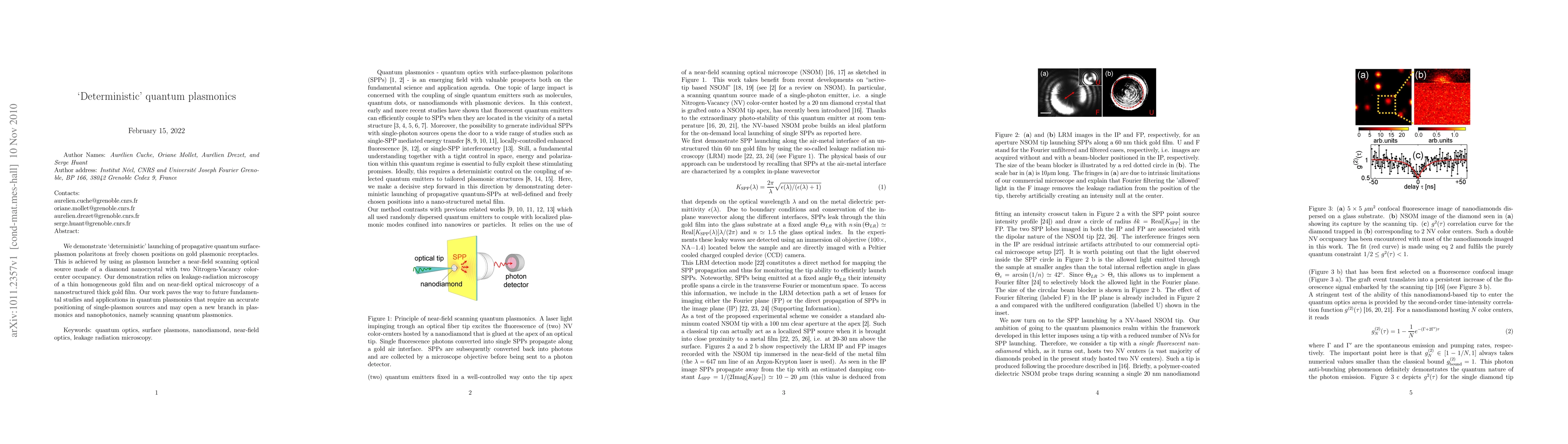 We demonstrate `deterministic' launching of propagative quantum surface-plasmon polaritons at freely chosen positions on gold plasmonic receptacles. This is achieved by using as plasmon launcher a near-field scanning optical source made of a diamond nanocrystal with two Nitrogen-Vacancy color-center occupancy. Our demonstration relies on leakage-radiation microscopy of a thin homogeneous gold film and on near-field optical microscopy of a nanostructured thick gold film. Our work paves the way to future fundamental studies and applications in quantum plasmonics that require an accurate positioning of single-plasmon sources and may open a new branch in plasmonics and nanophotonics, namely scanning quantum plasmonics.