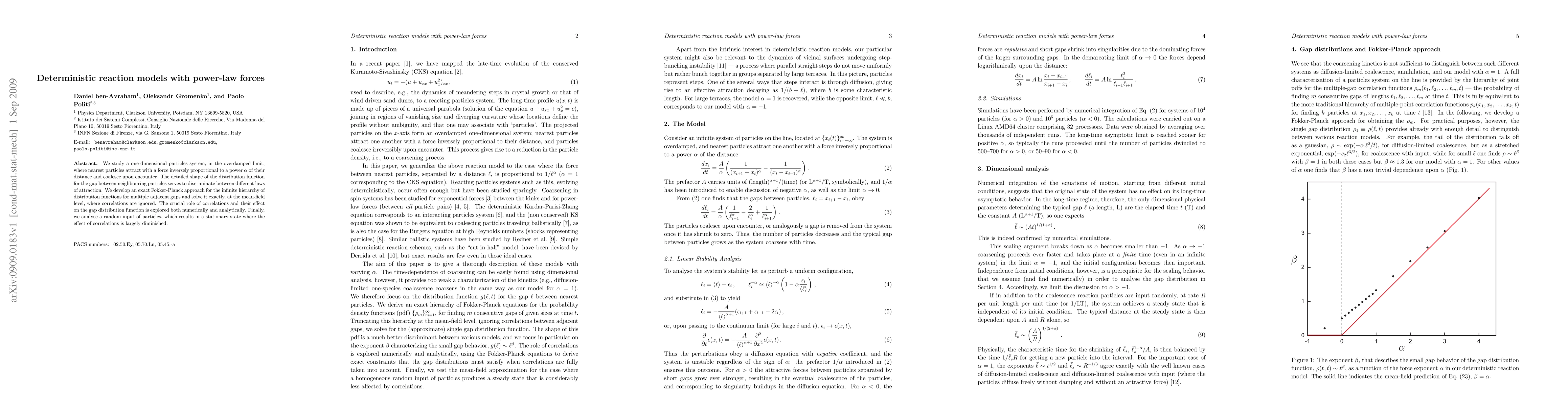 We study a one-dimensional particles system, in the overdamped limit, where nearest particles attract with a force inversely proportional to a power of their distance and coalesce upon encounter. The detailed shape of the distribution function for the gap between neighbouring particles serves to discriminate between different laws of attraction. We develop an exact Fokker-Planck approach for the infinite hierarchy of distribution functions for multiple adjacent gaps and solve it exactly, at the mean-field level, where correlations are ignored. The crucial role of correlations and their effect on the gap distribution function is explored both numerically and analytically. Finally, we analyse a random input of particles, which results in a stationary state where the effect of correlations is largely diminished.