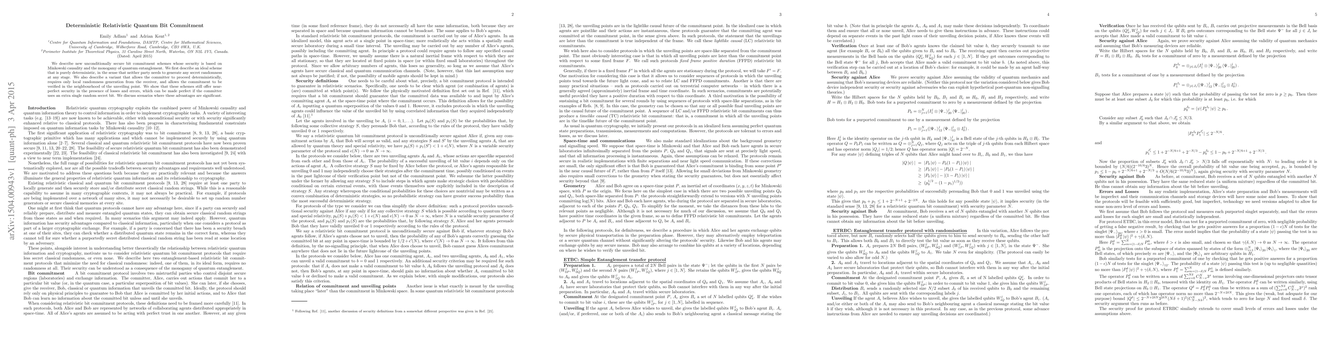 We describe new unconditionally secure bit commitment schemes whose security is based on Minkowski causality and the monogamy of quantum entanglement. We first describe an ideal scheme that is purely deterministic, in the sense that neither party needs to generate any secret randomness at any stage. We also describe a variant that allows the committer to proceed deterministically, requires only local randomness generation from the receiver, and allows the commitment to be verified in the neighbourhood of the unveiling point. We show that these schemes still offer near-perfect security in the presence of losses and errors, which can be made perfect if the committer uses an extra single random secret bit. We discuss scenarios where these advantages are significant.