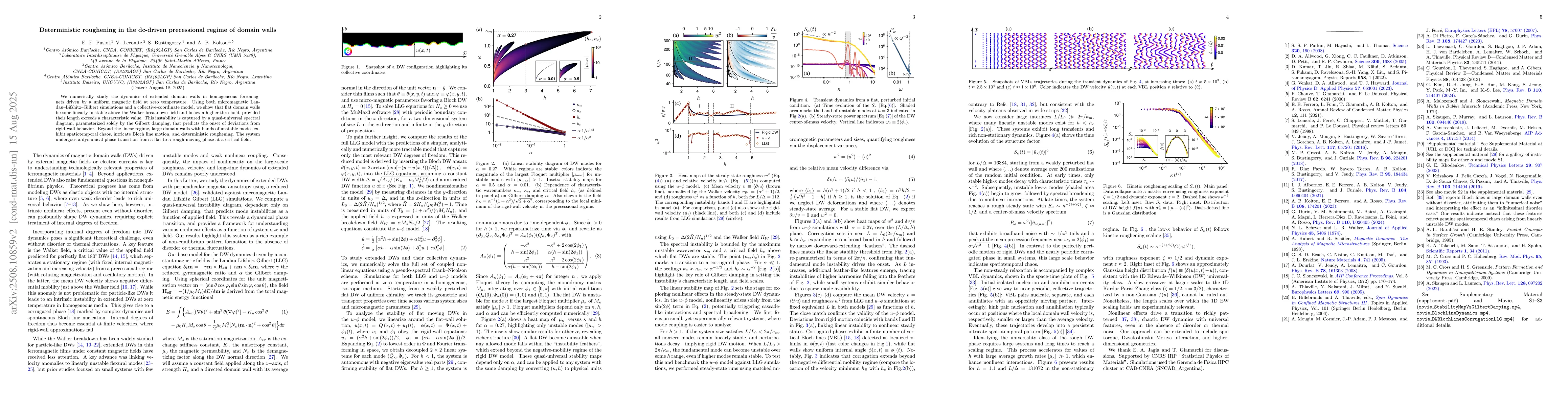 We numerically study the dynamics of extended domain walls in homogeneous ferromagnets driven by a uniform magnetic field at zero temperature. Using both micromagnetic Landau-Lifshitz-Gilbert simulations and a collective-coordinate model, we show that flat domain walls become linearly unstable above the Walker breakdown field and below a higher threshold, provided their length exceeds a characteristic value. This instability is captured by a quasi-universal spectral diagram, parameterized solely by the Gilbert damping, that predicts the onset of deviations from rigid-wall behavior. Beyond the linear regime, large domain walls with bands of unstable modes exhibit spatiotemporal chaos, intricate Bloch line motion, and deterministic roughening. The system undergoes a dynamical phase transition from a flat to a rough moving phase at a critical field.