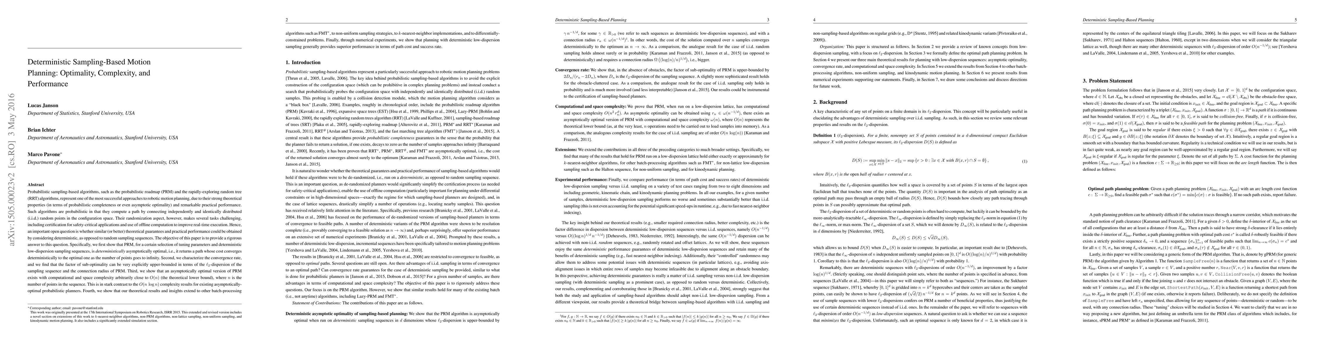 This paper investigates deterministic sampling-based motion planning algorithms, demonstrating that a deterministic variant of the probabilistic roadmap (PRM) can achieve asymptotic optimality, with a convergence rate explicitly bounded by sampling sequence dispersion. It also shows that such a deterministic PRM can operate with computational complexity close to O(n), significantly improving upon probabilistic planners.