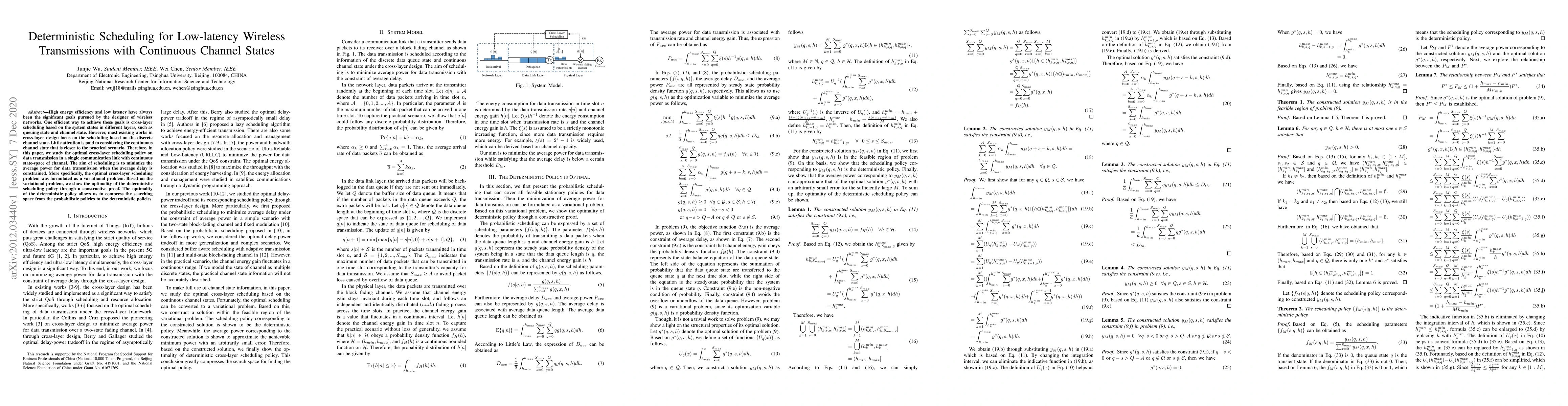 This paper proposes a deterministic scheduling policy for low-latency wireless transmissions considering continuous channel states, aiming to minimize average transmission power under delay constraints. The optimal scheduling is derived from a variational problem, demonstrating the policy's optimality through a constructive proof.