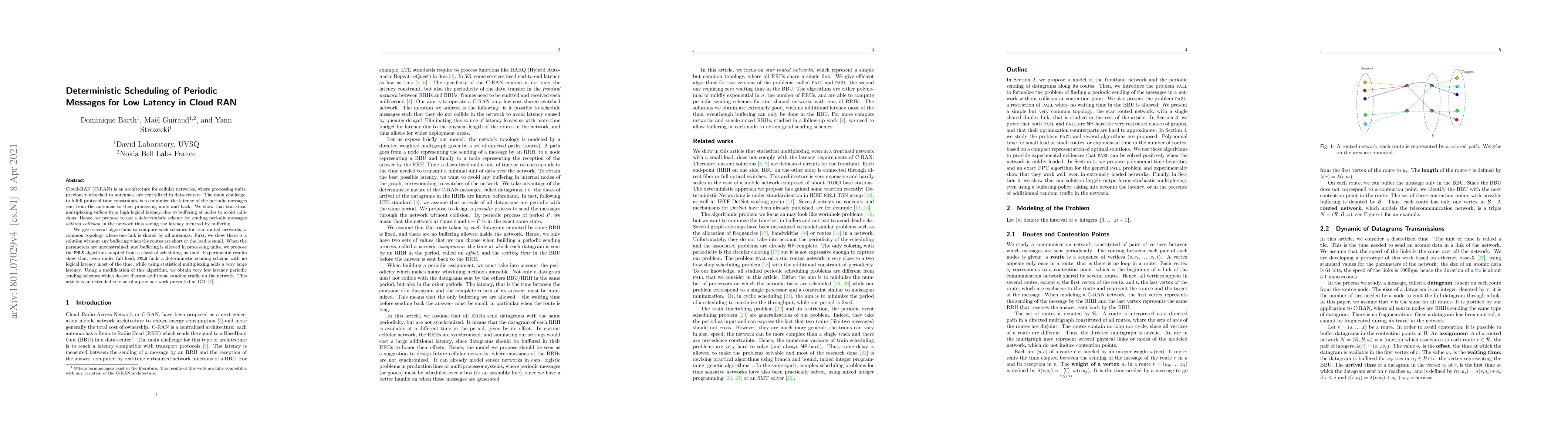 A recent trend in mobile networks is to centralize in distant data-centers the processing units which were attached to antennas until now. The main challenge is to guarantee that the latency of the periodic messages sent from the antennas to their processing units and back, fulfills protocol time constraints. We show that traditional statistical multiplexing does not allow such a low latency, due to collisions and buffering at nodes. Hence, we propose in this article to use a deterministic scheme for sending periodic messages without collisions in the network thus saving the latency incurred by buffering. We give several algorithms to compute such schemes for a common topology where one link is shared by all antennas. We show that there is always a solution when the routes are short or the load is small. When the parameters are unconstrained, and some buffering is allowed in the processing units, we propose an algorithm (PMLS) adapted from a classical scheduling method. The experimental results show that even under full load, most of the time PMLS finds a deterministic sending scheme with no latency.