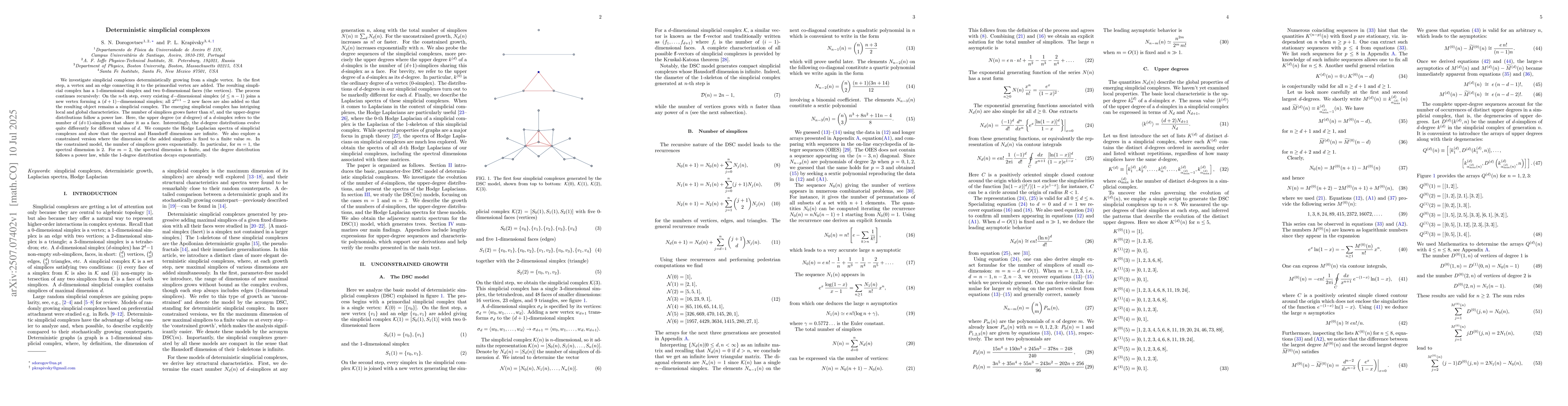 We investigate simplicial complexes deterministically growing from a single vertex. In the first step, a vertex and an edge connecting it to the primordial vertex are added. The resulting simplicial complex has a 1-dimensional simplex and two 0-dimensional faces (the vertices). The process continues recursively: On the $n$-th step, every existing $d-$dimensional simplex ($d\leq n-1$) joins a new vertex forming a $(d+1)-$dimensional simplex; all $2^{d+1}-2$ new faces are also added so that the resulting object remains a simplicial complex. The emerging simplicial complex has intriguing local and global characteristics. The number of simplices grows faster than $n!$, and the upper-degree distributions follow a power law. Here, the upper degree (or $d$-degree) of a $d$-simplex refers to the number of $(d{+}1)$-simplices that share it as a face. Interestingly, the $d$-degree distributions evolve quite differently for different values of $d$. We compute the Hodge Laplacian spectra of simplicial complexes and show that the spectral and Hausdorff dimensions are infinite. We also explore a constrained version where the dimension of the added simplices is fixed to a finite value $m$. In the constrained model, the number of simplices grows exponentially. In particular, for $m=1$, the spectral dimension is $2$. For $m=2$, the spectral dimension is finite, and the degree distribution follows a power law, while the $1$-degree distribution decays exponentially.