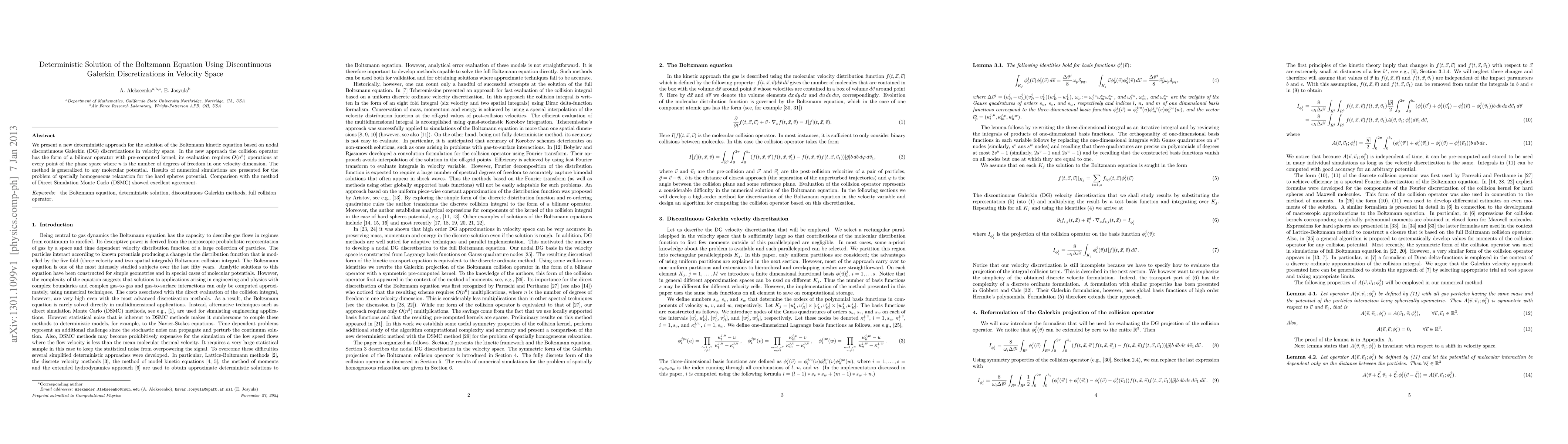 This paper introduces a deterministic method for solving the Boltzmann kinetic equation using nodal discontinuous Galerkin discretizations in velocity space, achieving $O(n^5)$ operations per phase space point. Numerical simulations for hard spheres potential show excellent agreement with Direct Simulation Monte Carlo results.