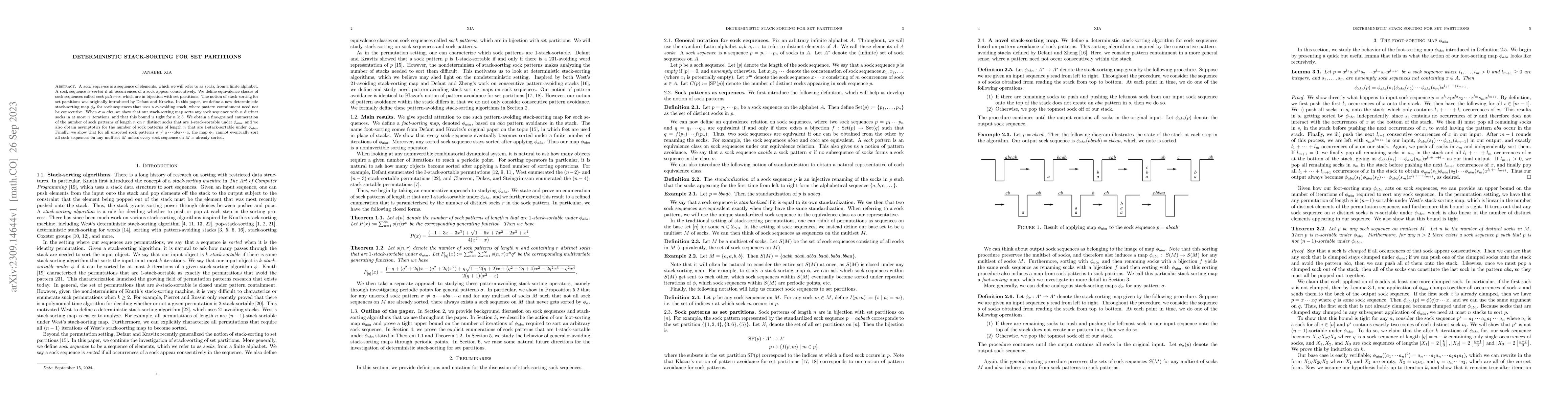 This paper introduces a deterministic stack-sorting map $\phi_{\sigma}$ for sock sequences, which sorts sequences using a $\sigma$-avoiding stack. For $\sigma = aba$, it shows that the map sorts sequences in at most $n$ iterations, with tight bounds for $n \geq 3$, and provides enumeration and asymptotics for $1$-stack-sortable patterns.