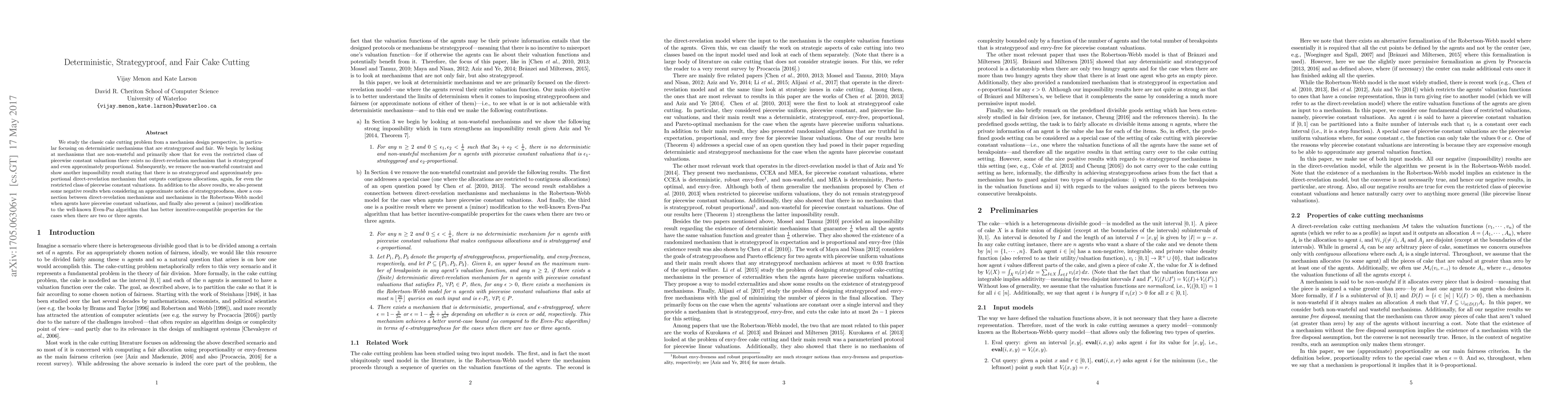 We study the classic cake cutting problem from a mechanism design perspective, in particular focusing on deterministic mechanisms that are strategyproof and fair. We begin by looking at mechanisms that are non-wasteful and primarily show that for even the restricted class of piecewise constant valuations there exists no direct-revelation mechanism that is strategyproof and even approximately proportional. Subsequently, we remove the non-wasteful constraint and show another impossibility result stating that there is no strategyproof and approximately proportional direct-revelation mechanism that outputs contiguous allocations, again, for even the restricted class of piecewise constant valuations. In addition to the above results, we also present some negative results when considering an approximate notion of strategyproofness, show a connection between direct-revelation mechanisms and mechanisms in the Robertson-Webb model when agents have piecewise constant valuations, and finally also present a (minor) modification to the well-known Even-Paz algorithm that has better incentive-compatible properties for the cases when there are two or three agents.