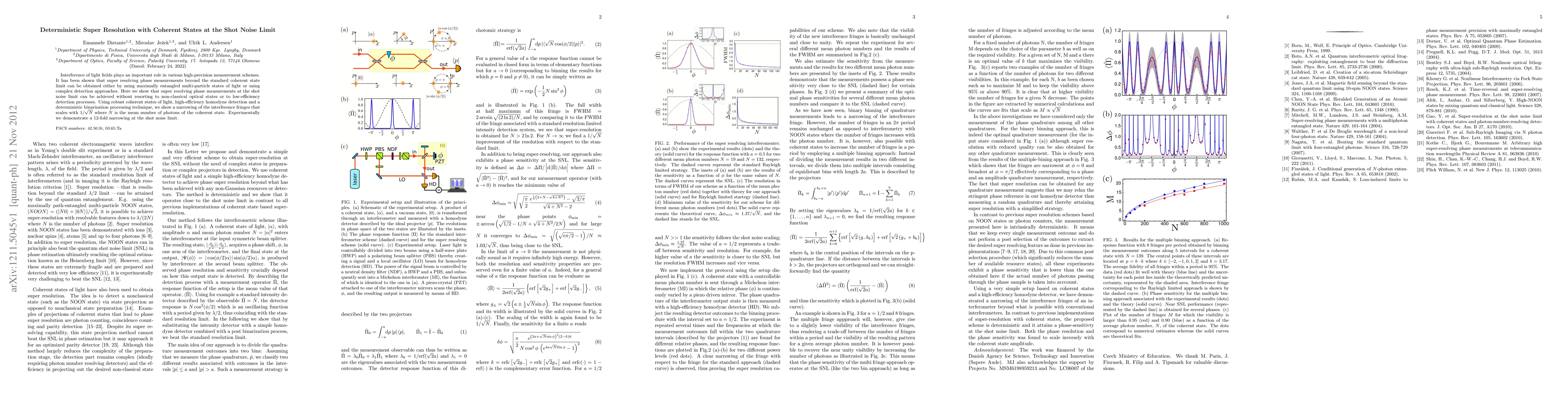 This paper demonstrates a method for achieving super-resolution phase measurements at the shot noise limit using robust coherent states, high-efficiency homodyne detection, and deterministic binarization, without requiring non-classical optical states or low-efficiency detection. Experimentally, it shows a 12-fold narrowing of interference fringes.