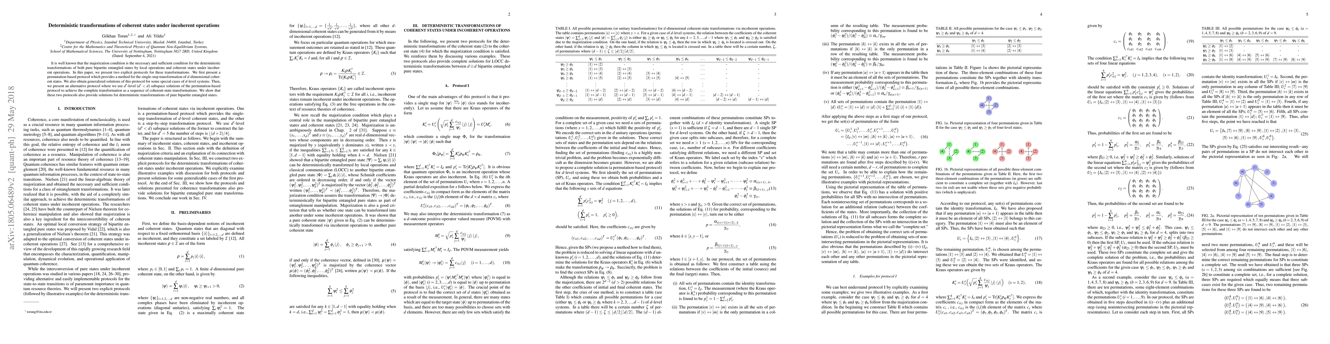 This paper introduces two protocols for deterministic transformations of coherent states under incoherent operations, including a permutation-based method for single-step transformations and a sequence-based approach using lower-level subspaces, both applicable to pure bipartite entangled states.