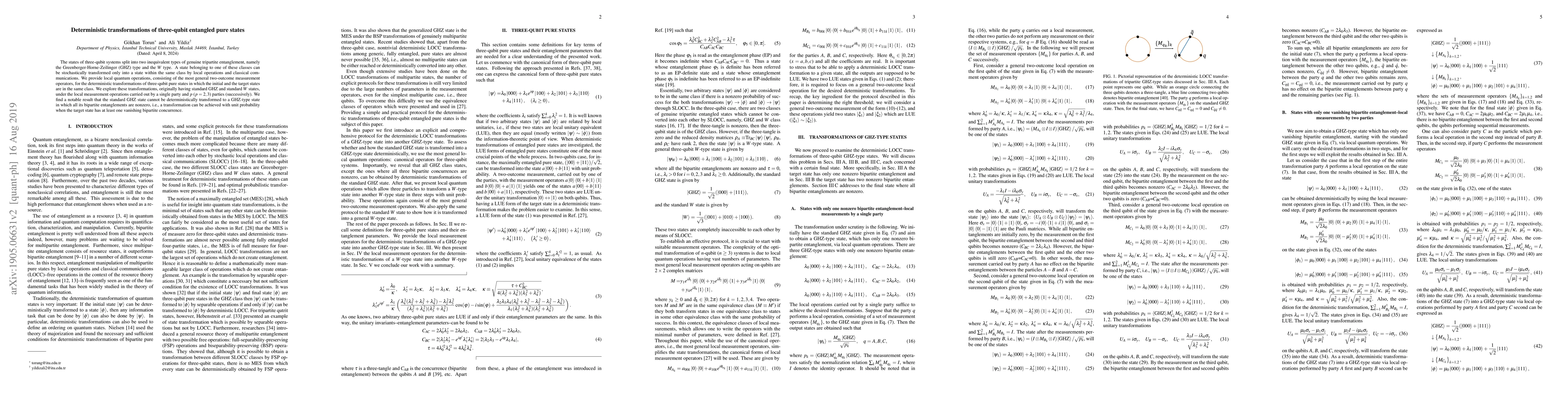 This paper presents deterministic local quantum operations for transforming three-qubit entangled pure states between the same classes of GHZ and W types, revealing that the standard GHZ state cannot be transformed to a GHZ-type state with all nonzero bipartite entanglements. The study explores transformations under local measurements by one or multiple parties.