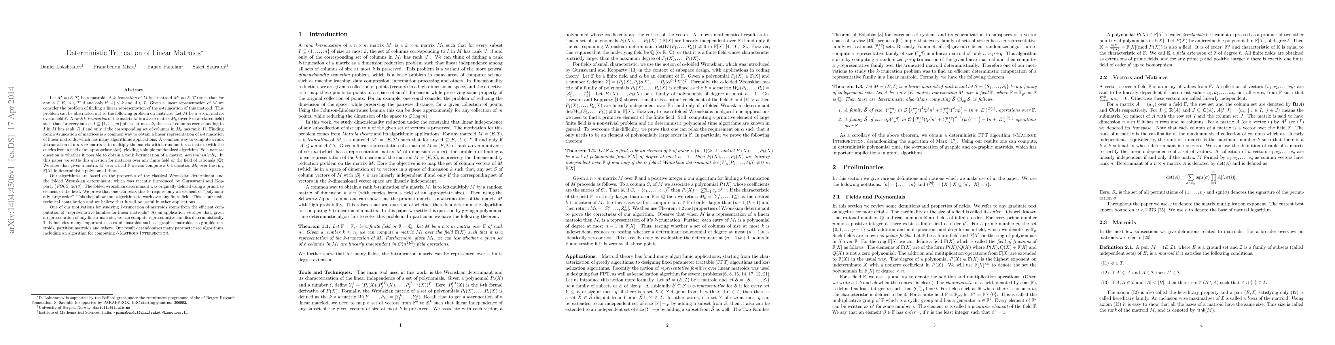 Let $M=(E,{\cal I})$ be a matroid. A {\em $k$-truncation} of $M$ is a matroid {$M'=(E,{\cal I}')$} such that for any $A\subseteq E$, $A\in {\cal I}'$ if and only if $|A|\leq k$ and $A\in {\cal I}$. Given a linear representation of $M$ we consider the problem of finding a linear representation of the $k$-truncation of this matroid. This problem can be abstracted out to the following problem on matrices. Let $M$ be a $n\times m$ matrix over a field $\mathbb{F}$. A {\em rank $k$-truncation} of the matrix $M$ is a $k\times m$ matrix $M_k$ (over $\mathbb{F}$ or a related field) such that for every subset $I\subseteq \{1,\ldots,m\}$ of size at most $k$, the set of columns corresponding to $I$ in $M$ has rank $|I|$ if and only of the corresponding set of columns in $M_k$ has rank $|I|$. Finding rank $k$-truncation of matrices is a common way to obtain a linear representation of $k$-truncation of linear matroids, which has many algorithmic applications. A common way to compute a rank $k$-truncation of a $n \times m$ matrix is to multiply the matrix with a random $k\times n$ matrix (with the entries from a field of an appropriate size), yielding a simple randomized algorithm. So a natural question is whether it possible to obtain a rank $k$-truncations of a matrix, {\em deterministically}. In this paper we settle this question for matrices over any finite field or the field of rationals ($\mathbb Q$). We show that given a matrix $M$ over a field $\mathbb{F}$ we can compute a $k$-truncation $M_k$ over the ring $\mathbb{F}[X]$ in deterministic polynomial time.