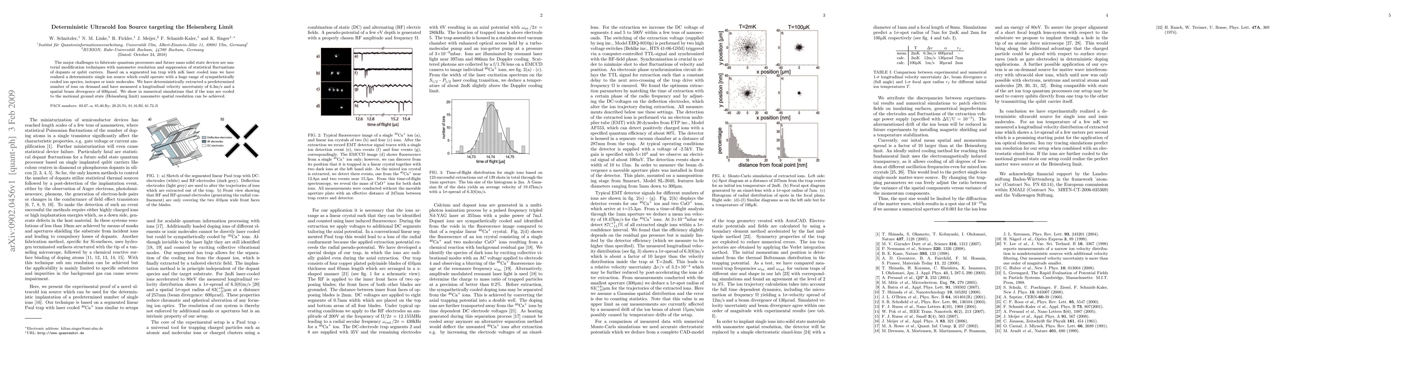 The major challenges to fabricate quantum processors and future nano solid state devices are material modification techniques with nanometre resolution and suppression of statistical fluctuations of dopants or qubit carriers. Based on a segmented ion trap with mK laser cooled ions we have realized a deterministic single ion source which could operate with a huge range of sympathetically cooled ion species, isotopes or ionic molecules. We have deterministically extracted a predetermined number of ions on demand and have measured a longitudinal velocity uncertainty of 6.3m/s and a spatial beam divergence of 0.6 mrad. We show in numerical simulations that if the ions are cooled to the motional ground state (Heisenberg limit) nanometre spatial resolution can be achieved.