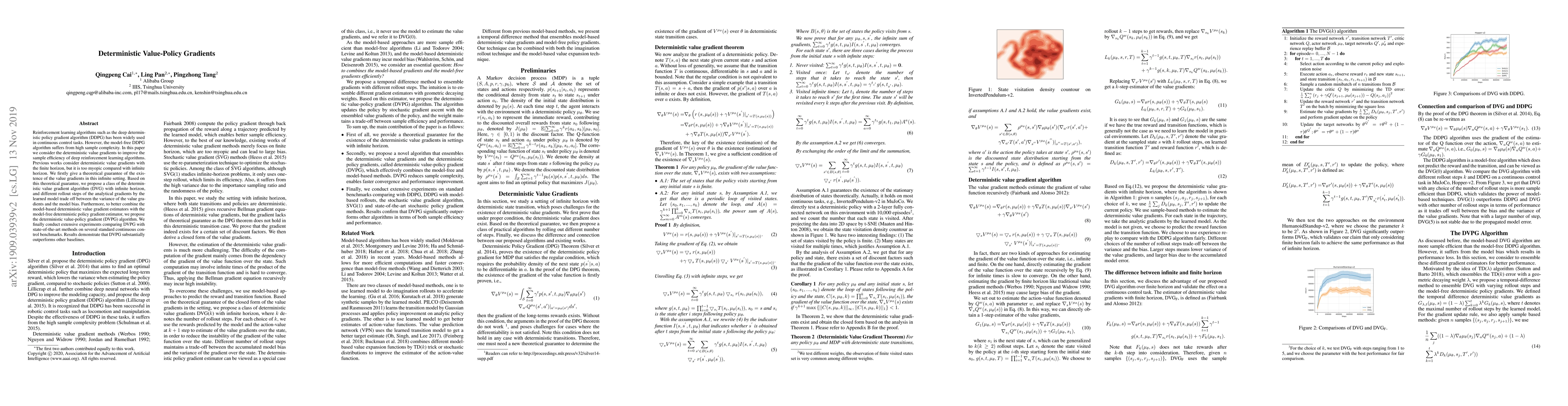 Reinforcement learning algorithms such as the deep deterministic policy gradient algorithm (DDPG) has been widely used in continuous control tasks. However, the model-free DDPG algorithm suffers from high sample complexity. In this paper we consider the deterministic value gradients to improve the sample efficiency of deep reinforcement learning algorithms. Previous works consider deterministic value gradients with the finite horizon, but it is too myopic compared with infinite horizon. We firstly give a theoretical guarantee of the existence of the value gradients in this infinite setting. Based on this theoretical guarantee, we propose a class of the deterministic value gradient algorithm (DVG) with infinite horizon, and different rollout steps of the analytical gradients by the learned model trade off between the variance of the value gradients and the model bias. Furthermore, to better combine the model-based deterministic value gradient estimators with the model-free deterministic policy gradient estimator, we propose the deterministic value-policy gradient (DVPG) algorithm. We finally conduct extensive experiments comparing DVPG with state-of-the-art methods on several standard continuous control benchmarks. Results demonstrate that DVPG substantially outperforms other baselines.