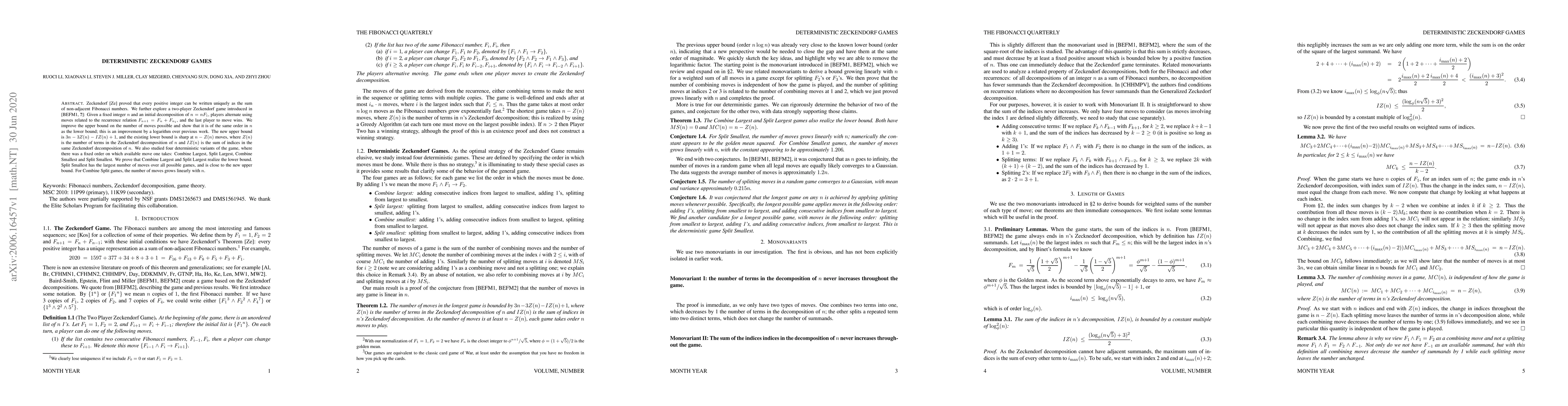 This paper explores a two-player Zeckendorf game where players alternate moves based on Fibonacci numbers, improving the upper bound on the number of moves to $3n - 3Z(n) - IZ(n) + 1$. It also studies four deterministic variants of the game, proving that Combine Largest and Split Largest achieve the lower bound, while Split Smallest has the most moves.