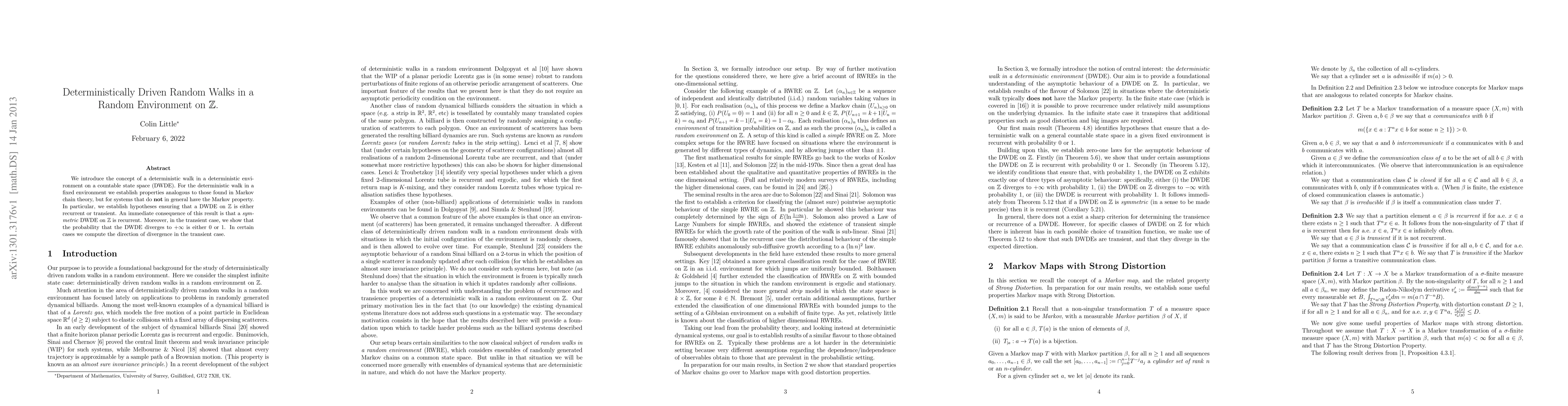 We introduce the concept of a deterministic walk in a deterministic environment on a countable state space (DWDE). For the deterministic walk in a fixed environment we establish properties analogous to those found in Markov chain theory, but for systems that do not in general have the Markov property. In particular, we establish hypotheses ensuring that a DWDE on $\Z$ is either recurrent or transient. An immediate consequence of this result is that a symmetric DWDE on $\Z$ is recurrent. Moreover, in the transient case, we show that the probability that the DWDE diverges to $+ \infty$ is either 0 or 1. In certain cases we compute the direction of divergence in the transient case.