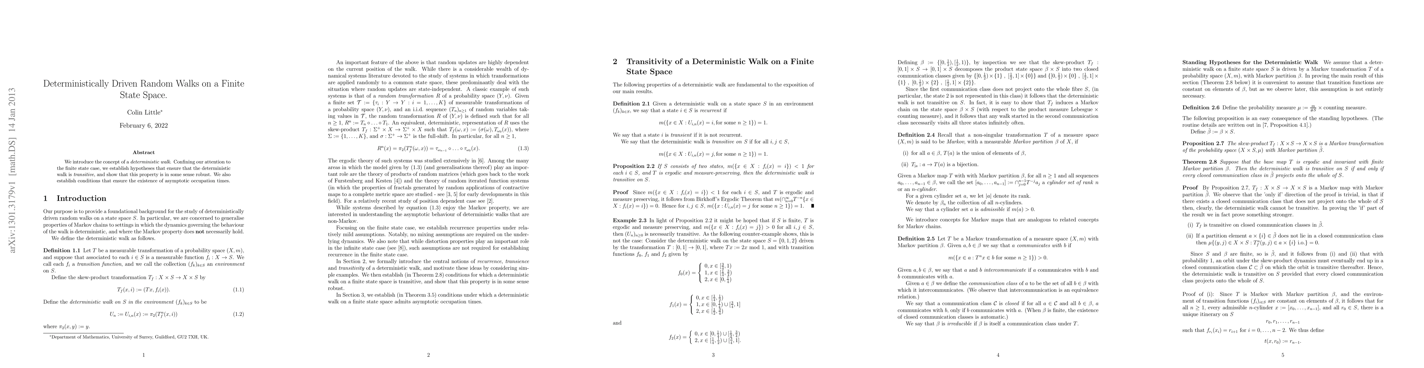 We introduce the concept of a deterministic walk. Confining our attention to the finite state case, we establish hypotheses that ensure that the deterministic walk is transitive, and show that this property is in some sense robust. We also establish conditions that ensure the existence of asymptotic occupation times.