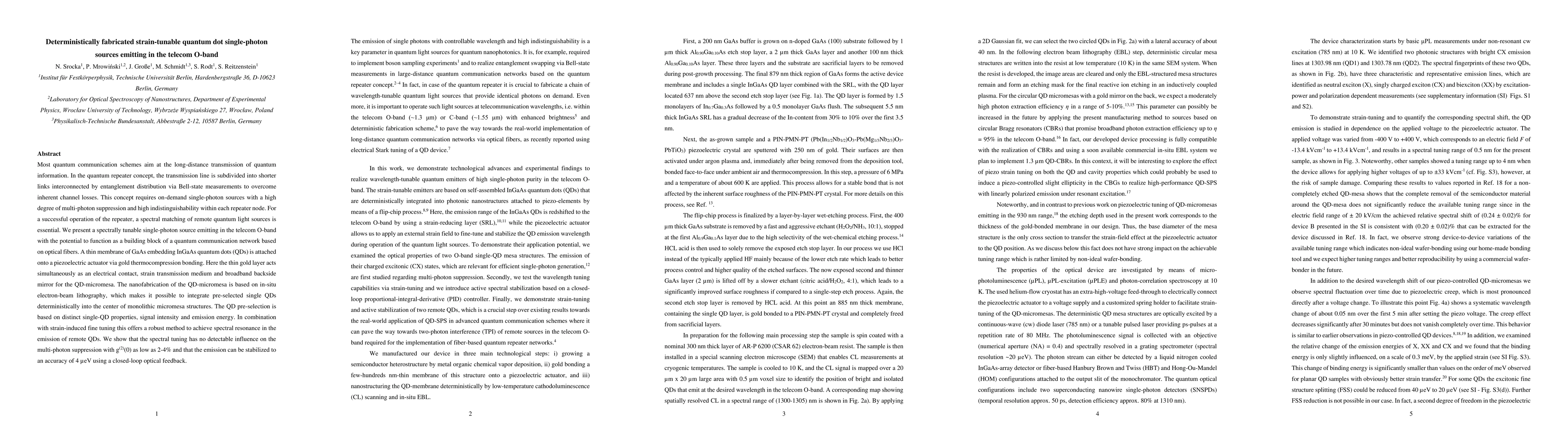This paper presents a deterministically fabricated, strain-tunable single-photon source emitting in the telecom O-band, suitable for quantum communication networks. The source uses a GaAs membrane with InGaAs quantum dots integrated via electron-beam lithography, enabling precise spectral tuning without affecting multi-photon suppression.