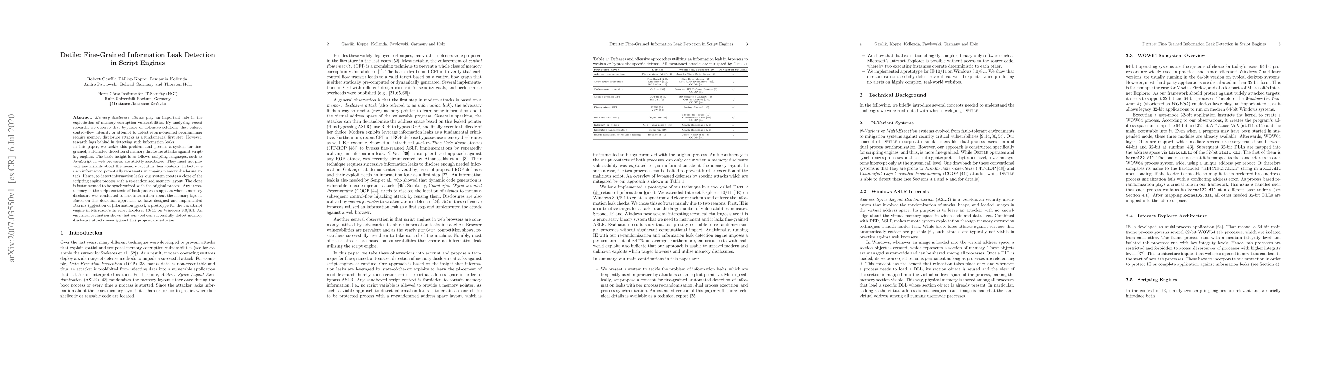 Memory disclosure attacks play an important role in the exploitation of memory corruption vulnerabilities. By analyzing recent research, we observe that bypasses of defensive solutions that enforce control-flow integrity or attempt to detect return-oriented programming require memory disclosure attacks as a fundamental first step. However, research lags behind in detecting such information leaks. In this paper, we tackle this problem and present a system for fine-grained, automated detection of memory disclosure attacks against scripting engines. The basic insight is as follows: scripting languages, such as JavaScript in web browsers, are strictly sandboxed. They must not provide any insights about the memory layout in their contexts. In fact, any such information potentially represents an ongoing memory disclosure attack. Hence, to detect information leaks, our system creates a clone of the scripting engine process with a re-randomized memory layout. The clone is instrumented to be synchronized with the original process. Any inconsistency in the script contexts of both processes appears when a memory disclosure was conducted to leak information about the memory layout. Based on this detection approach, we have designed and implemented Detile (\underline{det}ection of \underline{i}nformation \underline{le}aks), a prototype for the JavaScript engine in Microsoft's Internet Explorer 10/11 on Windows 8.0/8.1. An empirical evaluation shows that our tool can successfully detect memory disclosure attacks even against this proprietary software.