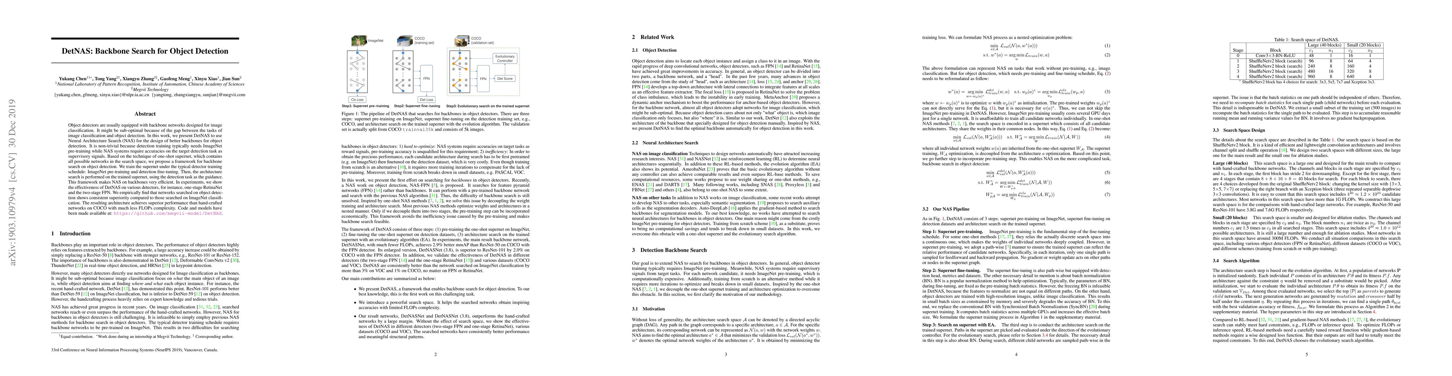 DetNAS employs Neural Architecture Search (NAS) to design optimized backbone networks for object detection, achieving better performance than ImageNet-trained networks. The technique of a one-shot supernet enables efficient NAS, leading to architectures that outperform hand-crafted networks on COCO with reduced computational complexity.
