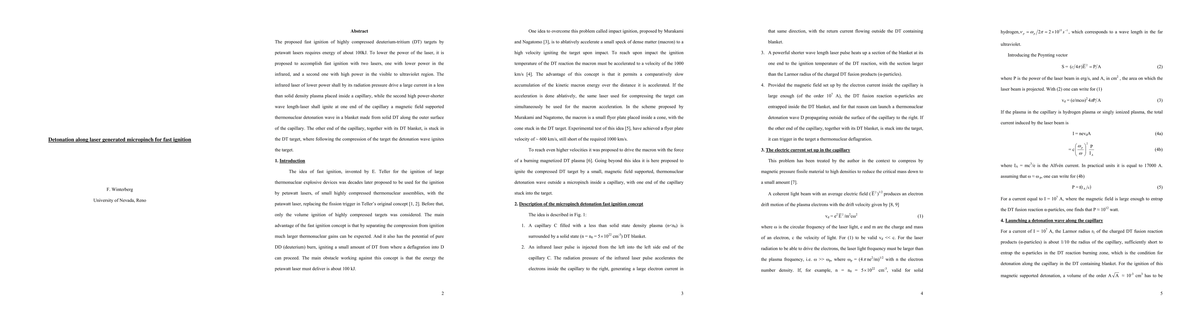 The proposed fast ignition of highly compressed deuterium-tritium (DT) targets by petawatt lasers requires energy of about 100kJ. To lower the power of the laser, it is proposed to accomplish fast ignition with two lasers, one with lower power in the infrared, and a second one with high power in the visible to ultraviolet region. The infrared laser of lower power shall by its radiation pressure drive a large current in a less than solid density plasma placed inside a capillary, while the second high power-shorter wave length-laser shall ignite at one end of the capillary a magnetic field supported thermonuclear detonation wave in a blanket made from solid DT along the outer surface of the capillary. The other end of the capillary, together with its DT blanket, is stuck in the DT target, where following the compression of the target the detonation wave ignites the target.