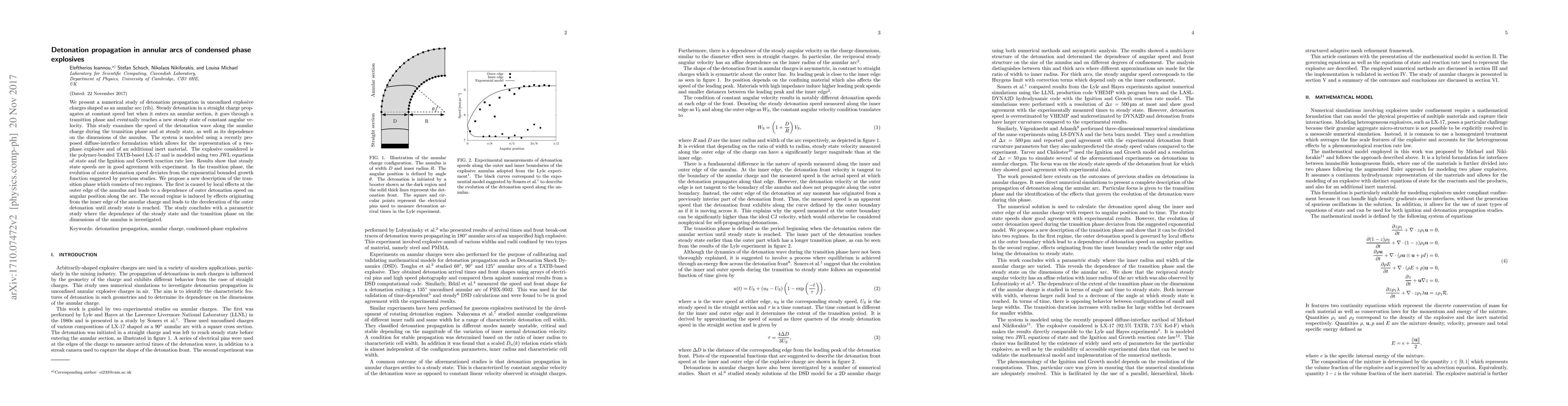 We present a numerical study of detonation propagation in unconfined explosive charges shaped as an annular arc (rib). Steady detonation in a straight charge propagates at constant speed but when it enters an annular section, it goes through a transition phase and eventually reaches a new steady state of constant angular velocity. This study examines the speed of the detonation wave along the annular charge during the transition phase and at steady state, as well as its dependence on the dimensions of the annulus. The system is modeled using a recently proposed diffuse-interface formulation which allows for the representation of a two-phase explosive and of an additional inert material. The explosive considered is the polymer-bonded TATB-based LX-17 and is modeled using two JWL equations of state and the Ignition and Growth reaction rate law. Results show that steady state speeds are in good agreement with experiment. In the transition phase, the evolution of outer detonation speed deviates from the exponential bounded growth function suggested by previous studies. We propose a new description of the transition phase which consists of two regimes. The first is caused by local effects at the outer edge of the annulus and leads to a dependence of outer detonation speed on angular position along the arc. The second regime is induced by effects originating from the inner edge of the annular charge and leads to the deceleration of the outer detonation until steady state is reached. The study concludes with a parametric study where the dependence of the steady state and the transition phase on the dimensions of the annulus is investigated.