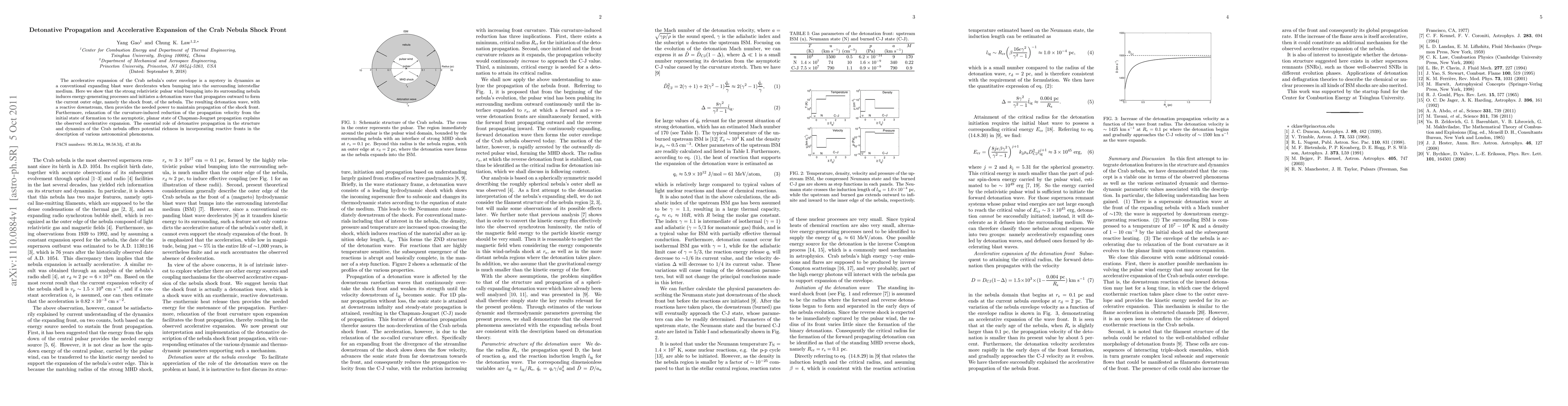 The Crab Nebula's outer envelope exhibits accelerative expansion due to a detonation wave initiated by a relativistic pulsar wind, which sustains the shock front's propagation. This detonative mechanism explains the nebula's observed acceleration and suggests a broader role for reactive fronts in astronomical dynamics.