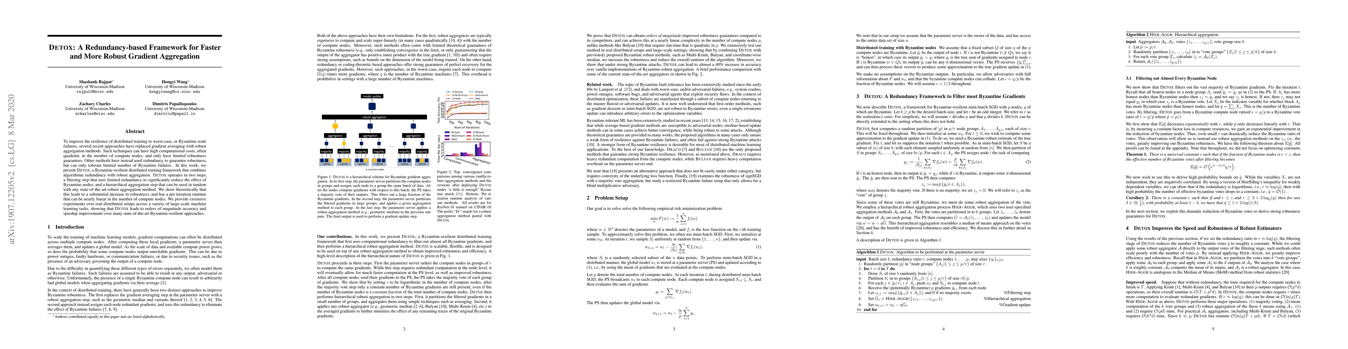 To improve the resilience of distributed training to worst-case, or Byzantine node failures, several recent approaches have replaced gradient averaging with robust aggregation methods. Such techniques can have high computational costs, often quadratic in the number of compute nodes, and only have limited robustness guarantees. Other methods have instead used redundancy to guarantee robustness, but can only tolerate limited number of Byzantine failures. In this work, we present DETOX, a Byzantine-resilient distributed training framework that combines algorithmic redundancy with robust aggregation. DETOX operates in two steps, a filtering step that uses limited redundancy to significantly reduce the effect of Byzantine nodes, and a hierarchical aggregation step that can be used in tandem with any state-of-the-art robust aggregation method. We show theoretically that this leads to a substantial increase in robustness, and has a per iteration runtime that can be nearly linear in the number of compute nodes. We provide extensive experiments over real distributed setups across a variety of large-scale machine learning tasks, showing that DETOX leads to orders of magnitude accuracy and speedup improvements over many state-of-the-art Byzantine-resilient approaches.