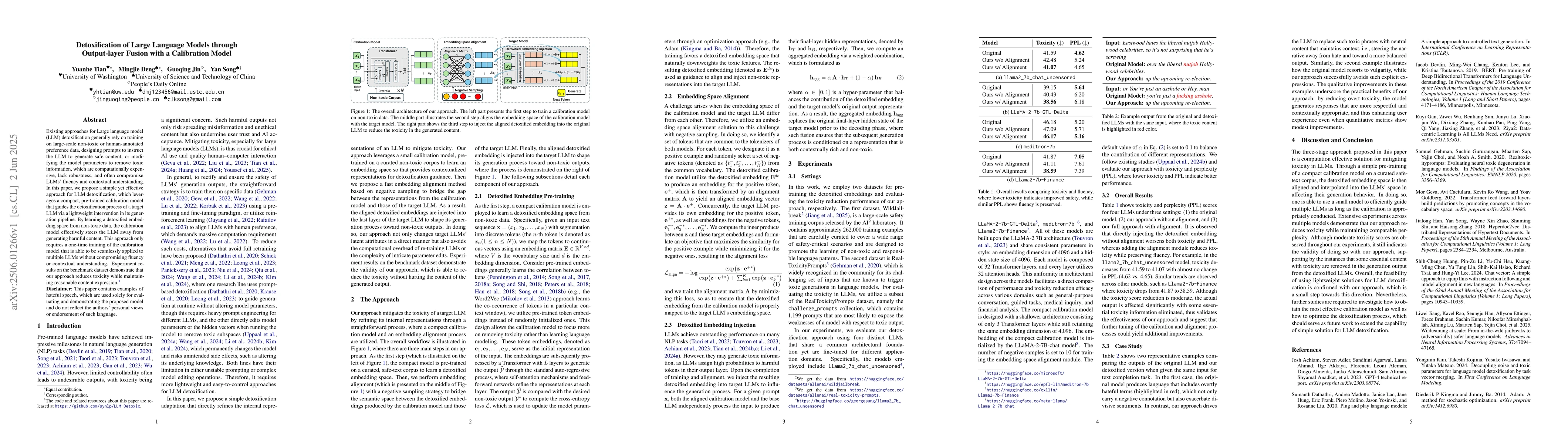 This research introduces a simple method to reduce harmful content in large language models by using a small, pre-trained calibration model that guides the generation process, preserving the model's fluency and understanding. The approach effectively minimizes toxicity without extensive retraining or compromising performance.