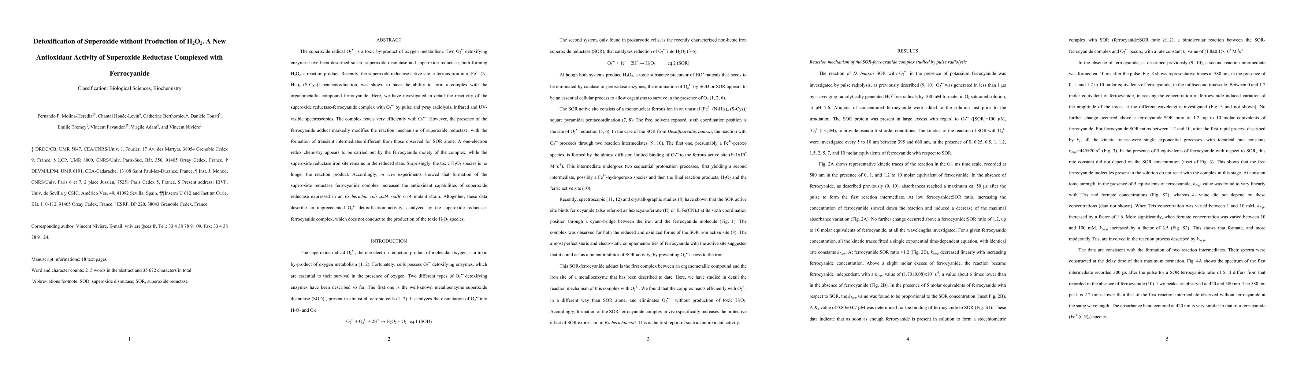 This paper investigates the detoxification of superoxide radicals by the superoxide reductase complexed with ferrocyanide, revealing a novel mechanism that avoids the production of toxic H2O2, thereby enhancing antioxidant capabilities in Escherichia coli.