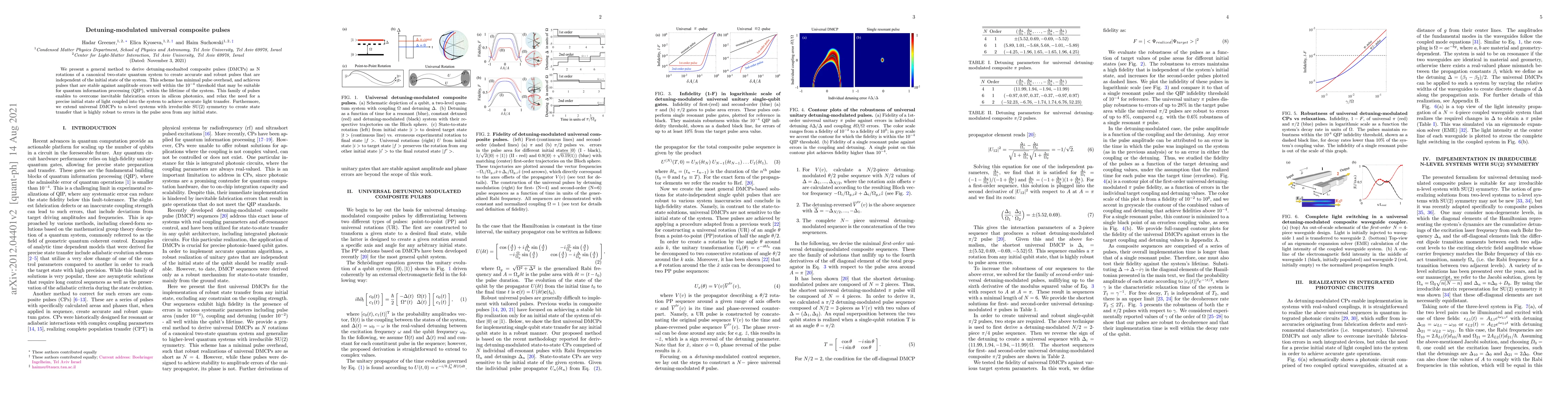 We present a general method to derive detuning-modualted composite pulses (DMCPs) as N rotations of a canonical two-state quantum system to create accurate and robust pulses that are independent of the initial state of the system. This scheme has minimal pulse overhead, and achieves pulses that are stable against amplitude errors well within the $10^{-4}$ threshold that may be suitable for quantum information processing (QIP), within the lifetime of the system. This family of pulses enables to overcome inevitable fabrication errors in silicon photonics, and relax the need for a precise initial state of light coupled into the system to achieve accurate light transfer. Furthermore, we extend universal DMCPs to n-level systems with irreducible SU(2) symmetry to create state transfer that is highly robust to errors in the pulse area from any initial state.